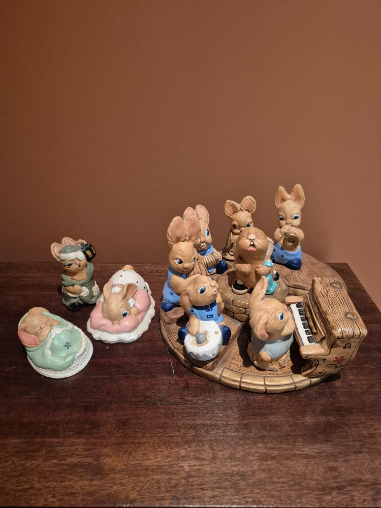 Selling a cute musical bunny figurine set. It features several bunnies playing instruments on a wooden stage, plus a few other sleeping bunnies. Perfect for a collector or as a charming decor piece