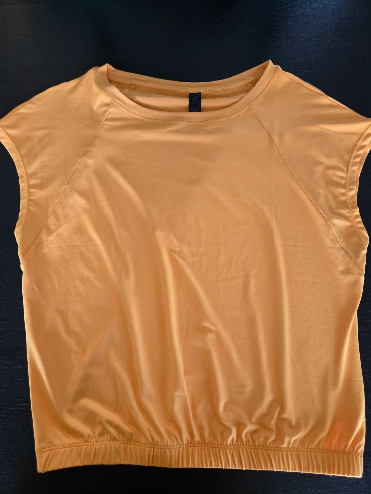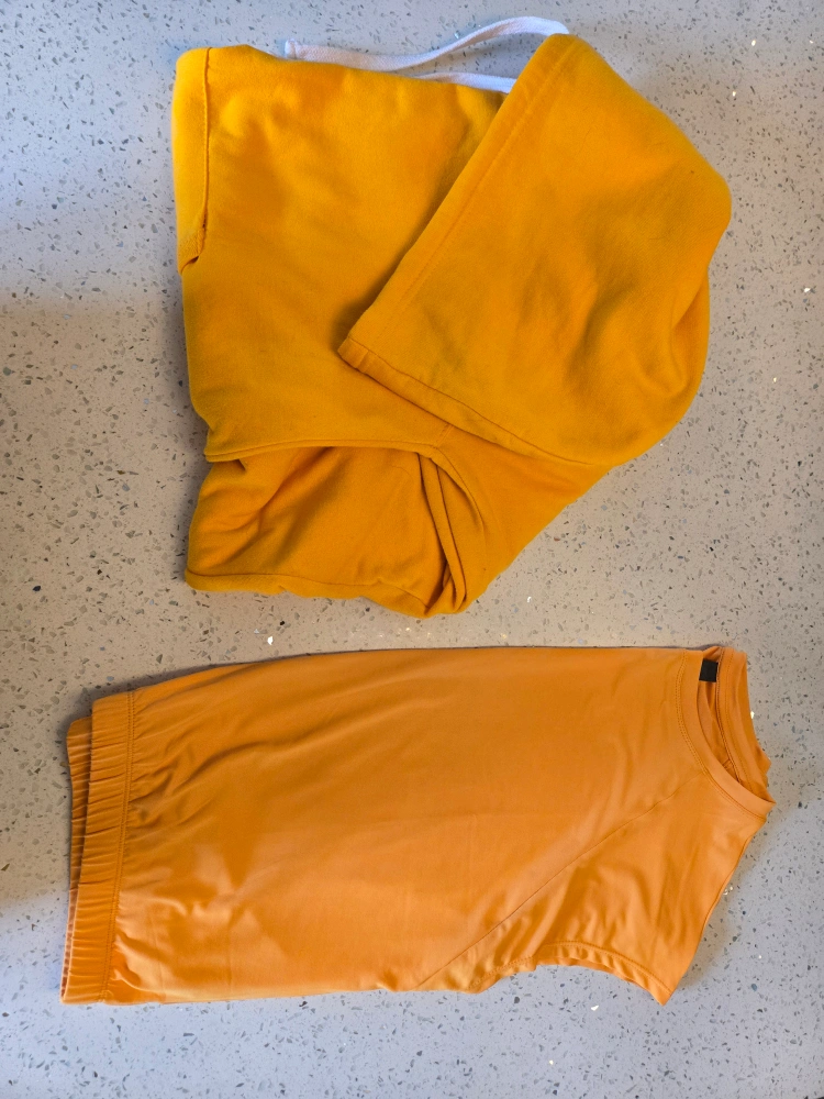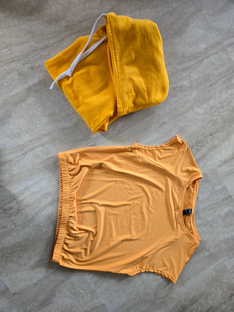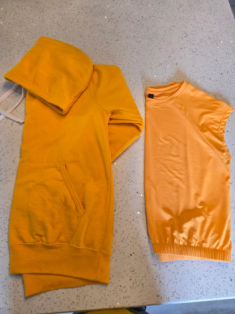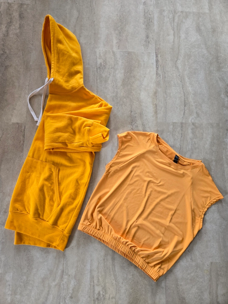 Women's athletic wear set. Includes a mustard yellow hoodie and a matching sleeveless top. Comfortable and stylish. Perfect for working out or casual wear. Both will fit a size small