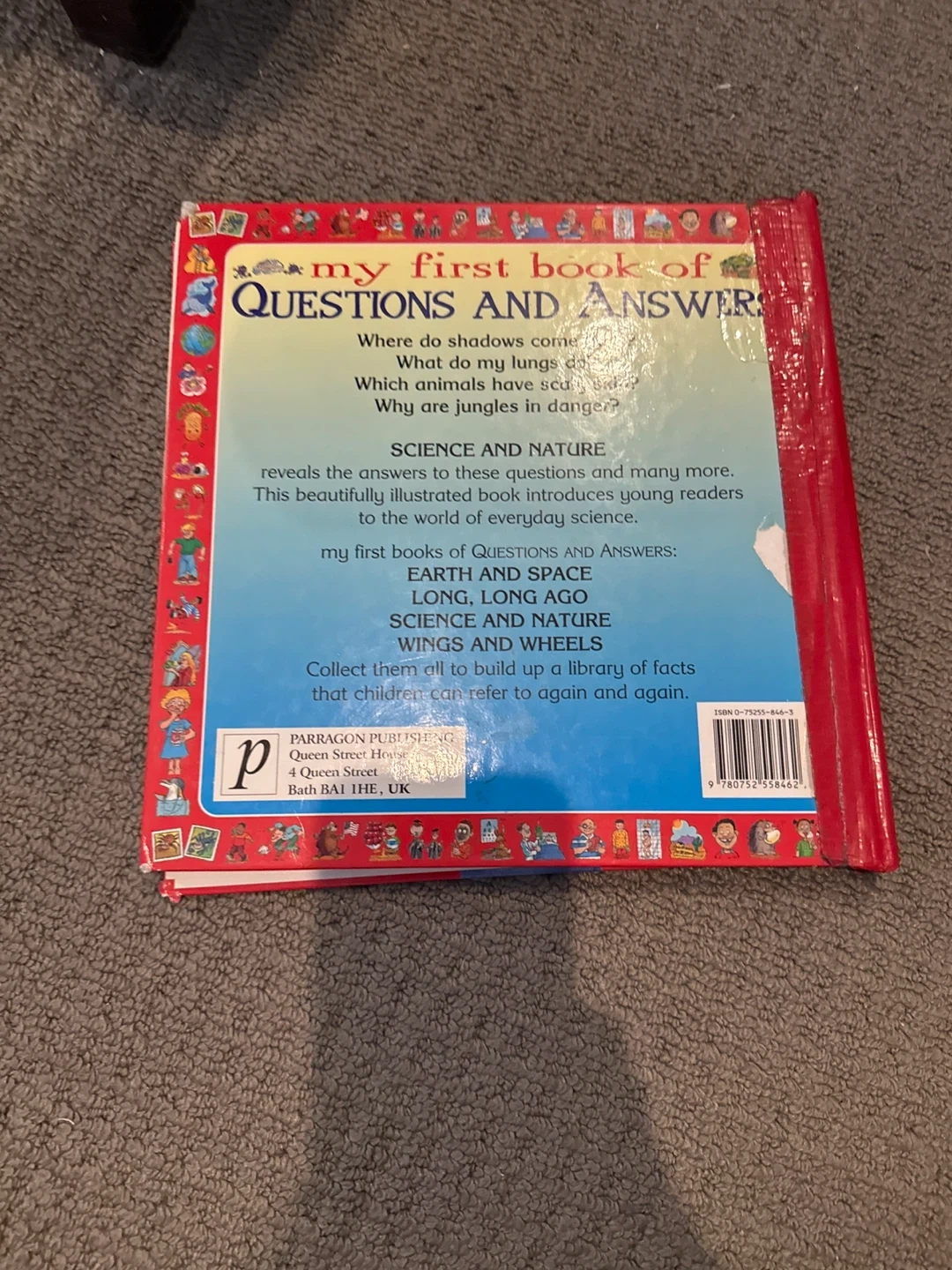 I’m selling a copy of “My First Book of Questions and Answers about Science and Nature.” It’s a beautifully illustrated book that introduces young readers to the world of everyday science. This book is part of a series that includes titles like “Earth and Space,” “Long, Long Ago,” and “Wings and Wheels.” While it’s not in the best condition, it’s still in good condition.