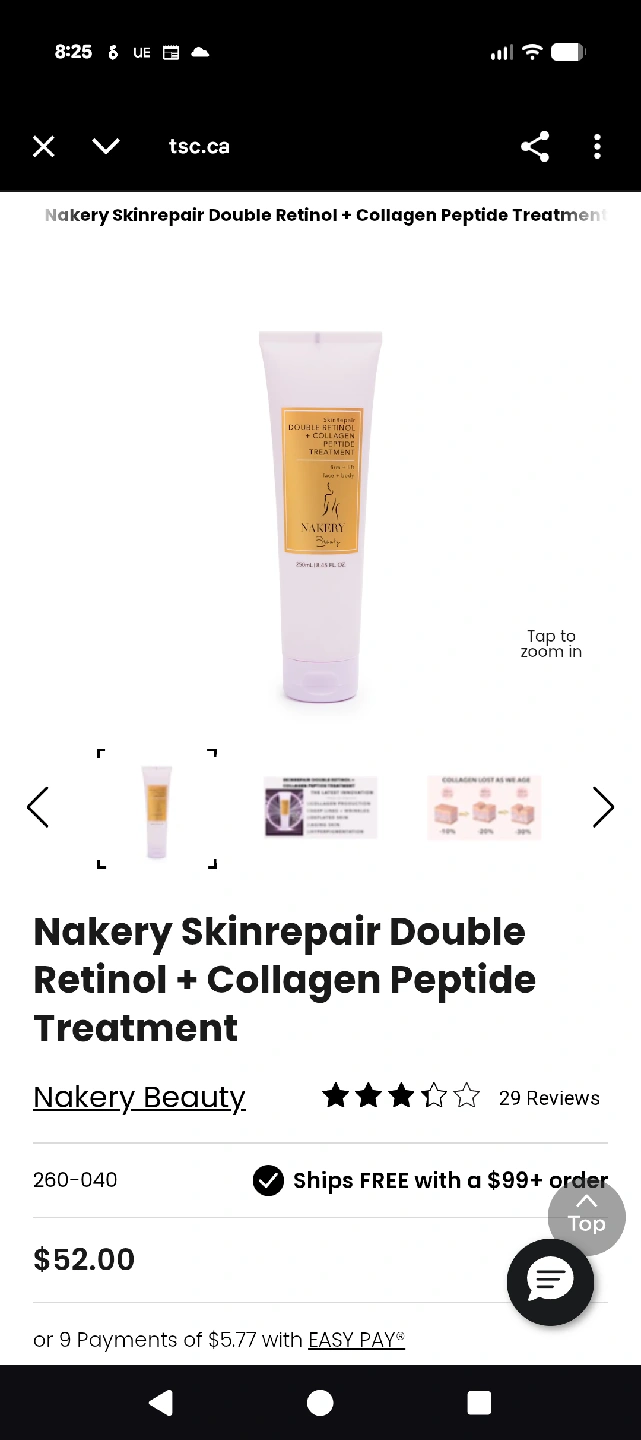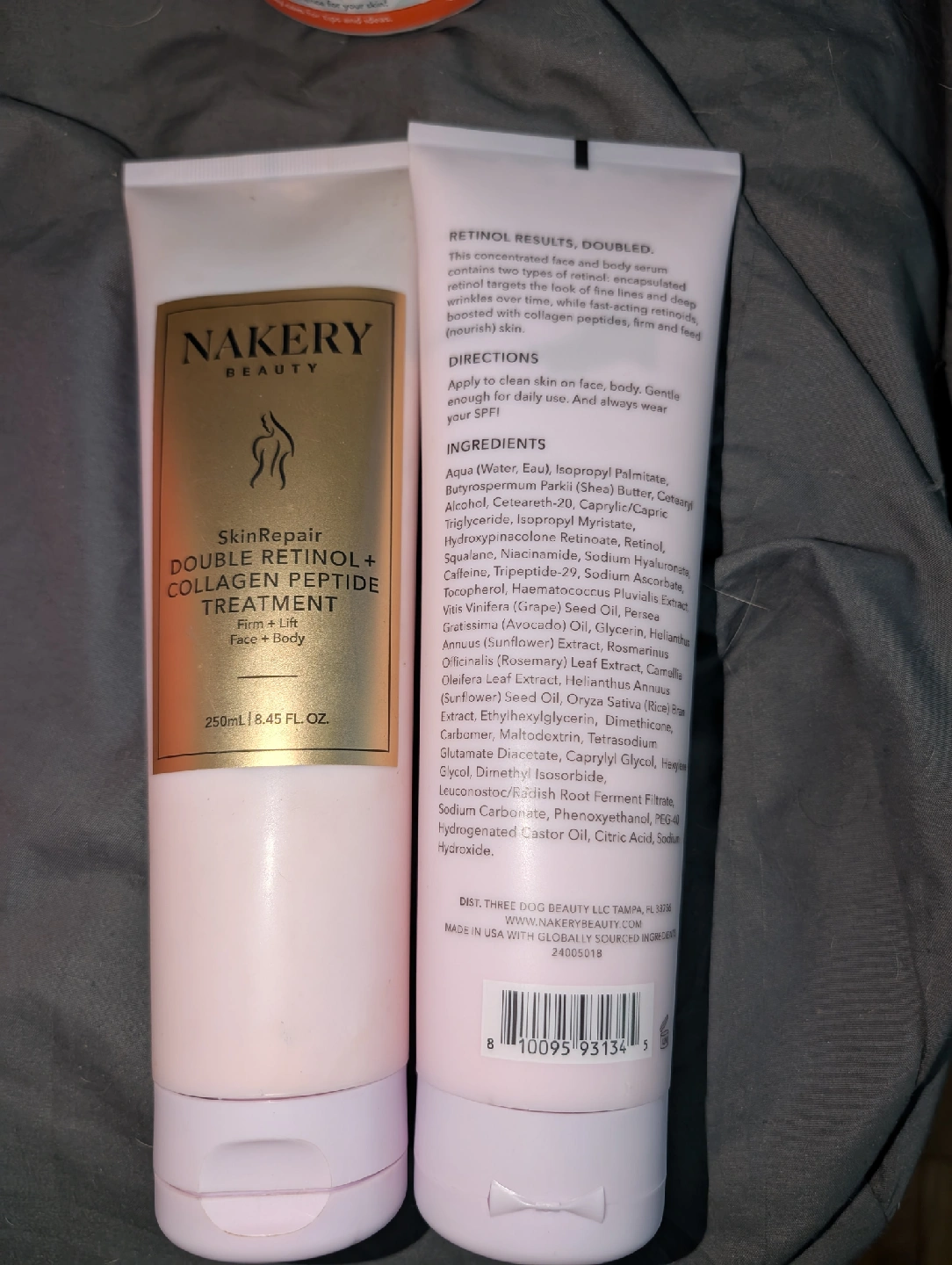 Nakery Beauty SkinRepair Double Retinol + Collagen Peptide Treatment helps firm and lift your skin. This treatment contains two types of retinol and collagen peptides to reduce fine lines and deep wrinkles. It's a concentrated delivery serum that helps your skin look nourished. The bottle contains 250ml / 8.45 fl oz