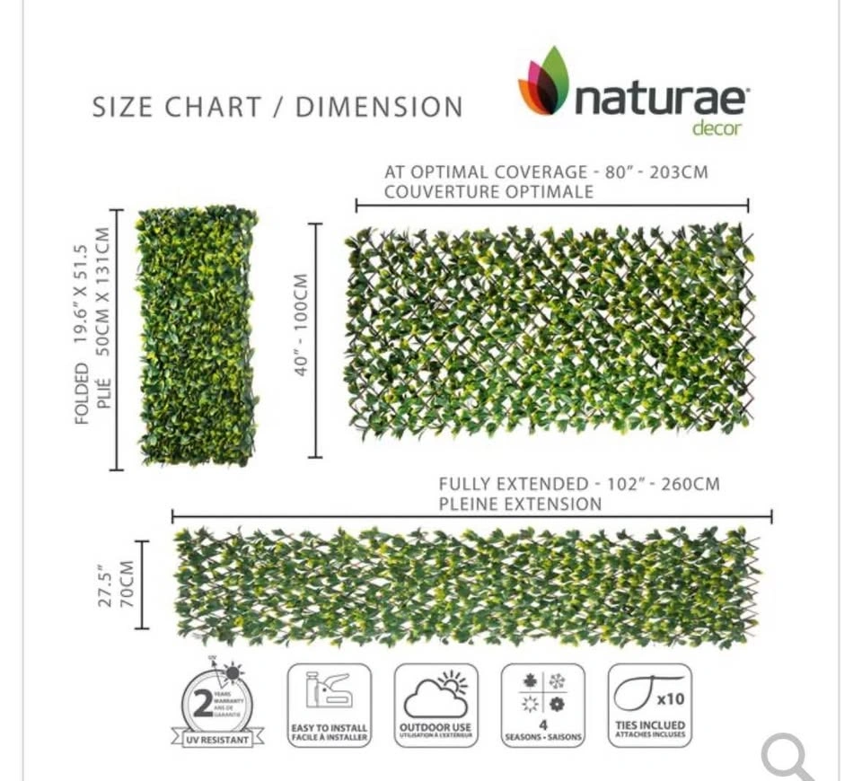 Naturae Decor Expandable Willow Trellis with Artificial Foliage. Used for one summer only. Pick up in Altadore / Marda Loop area SW. The Naturae Decor expandable trellis will be the perfect addition to add style and lifelike vegetation to your outdoor space. Made from high-quality materials and offering optimal privacy with UV-protected leaves, you can enjoy the product for years without having to replace it. A versatile solution to redesign and brighten up any space, whether it’s a patio, a deck, or a balcony. The realistic luxurious artificial foliage requires no maintenance. Easy to install and made of sturdy but lightweight materials for outdoor use. Simply secure to a support and extend the trellis to the desired width and height. Standard size – optimal extension 40 in x 80 in, and maximum extension 20 in x 100 in (16 in x 48 in when folded). The expandable trellis is a cost-effective way to bring privacy and beauty to your project regardless of its size. PRIVACY FOR YOUR SPACE - Naturae Decor privacy screens are the perfect way to create a serene environment and hide from unwanted views on your deck, patio, balcony. EXPANDABLE TRELLIS - Simply extend the trellis to the size and density you need. Optimal dimensions are 36 in x 72 in, but the trellis can be expanded to a maximum of 18 in x 90 in. UV RESISTANT - Leaves on our privacy screens are made of high-grade polyethylene. They are UV resistant to prevent fading, and easy to clean. REALISTIC ARTIFICIAL FOLIAGE - Built to withstand the seasons and provide year-round style and privacy to your outdoor space. Comes with a 2-year warranty. LIGHTWEIGHT MATERIALS -Our expandable trellises are made of willow which makes them lightweight all the while making sure your patio privacy screens always stay upright, and in place. Easy-to-install, it will bring intimacy and beauty to all your projects, regardless of their scope.