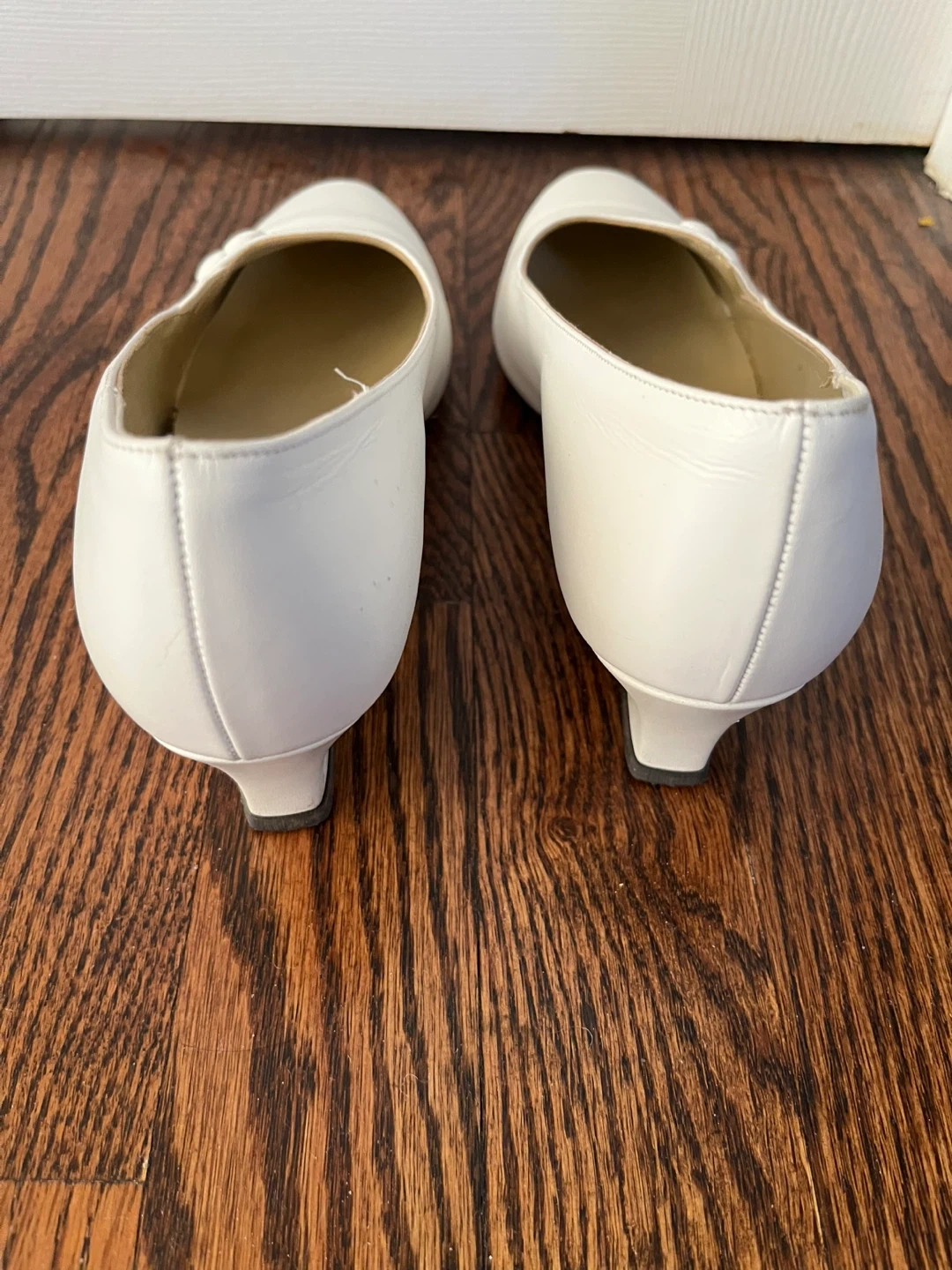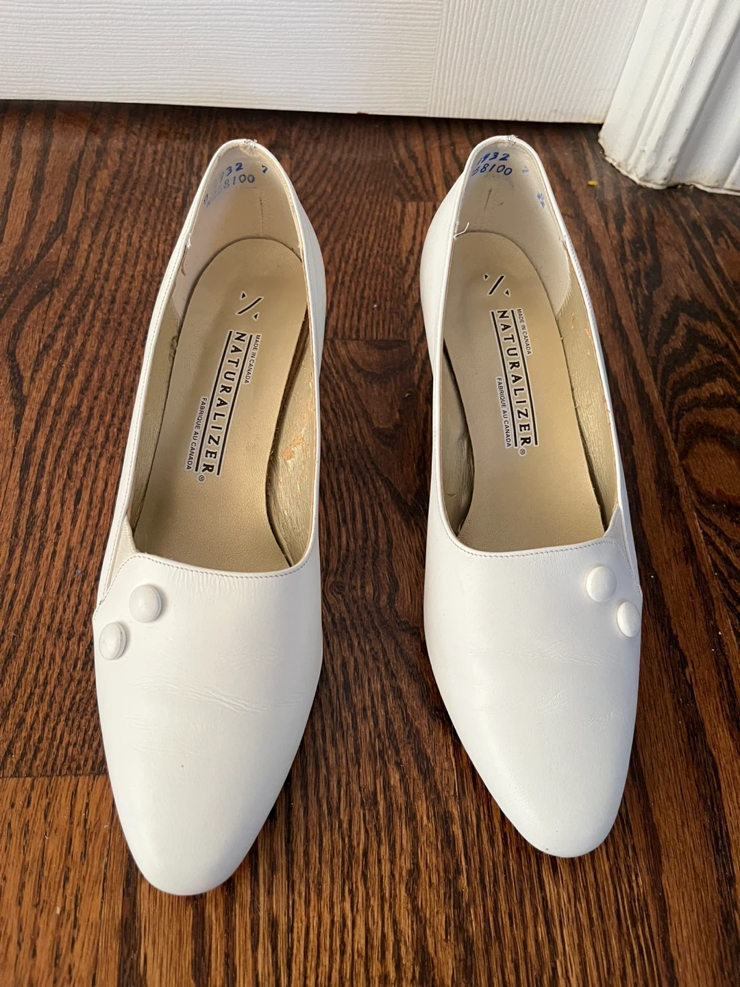 Selling a pair of Naturalizer heels in size 7! They're a classic white leather and would be great for any occasion. They have a few scuffs on the bottom, but are otherwise in good shape