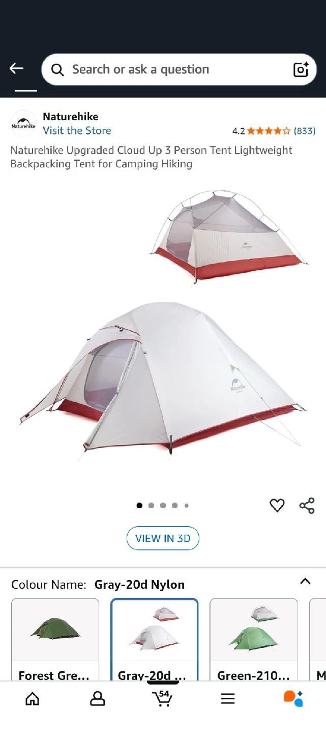 Selling a Naturehike Cloud Up 3 person tent in gray. It's a lightweight backpacking tent with excellent ventilation and no condensation. Key features: - Mesh inner tent and two air vents - Sleeps 3 people - Weighs 2.3kg/5.07lbs - Packs down to 51 x 18cm/20 x 7.1 inches - Easy setup in 2 minutes