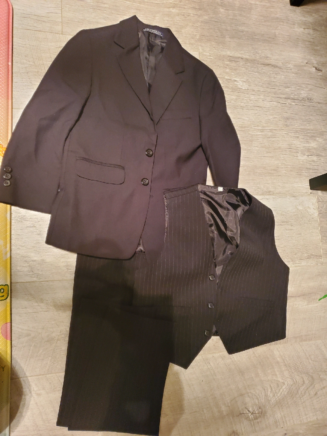 Selling a gently used Nautica 2-piece suit 5-6 year old.The set includes a blazer and pants. The shell is made of 60% polyester and 40% rayon, while the lining/doublure is 100% polyester. Also comes with a vest!