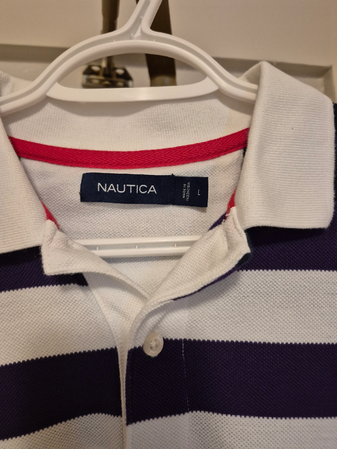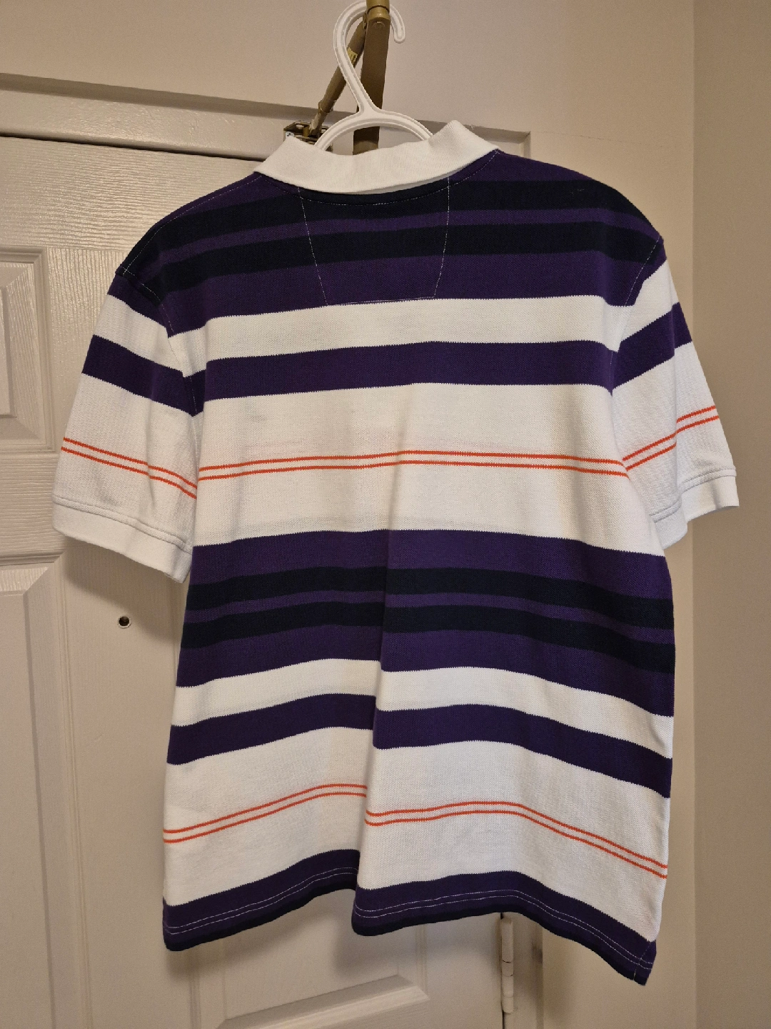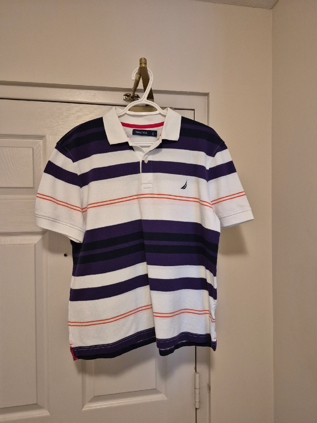 Selling a gently used Nautica polo shirt in size L. It features a classic striped pattern with purple, white, and orange accents, which would go well with a UWO student's wardrobe and budget, but also a great addition to any wardrobe! 🎓♾️♻️ Curbside pickup M-Sat 5pm-9pm Or Delivery within London for an extra $5!