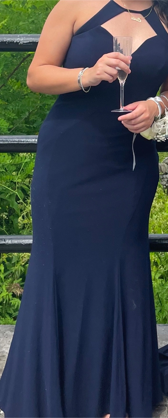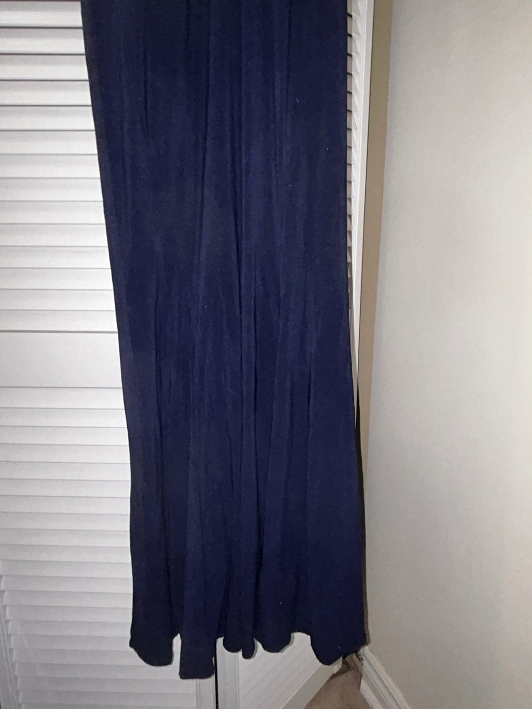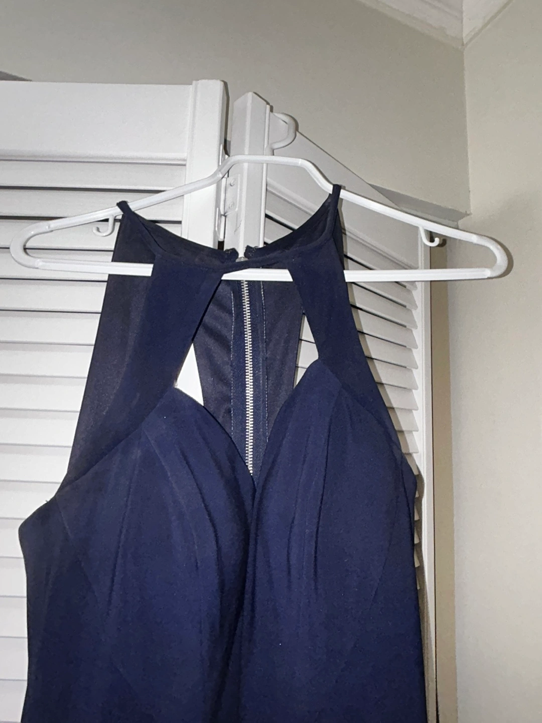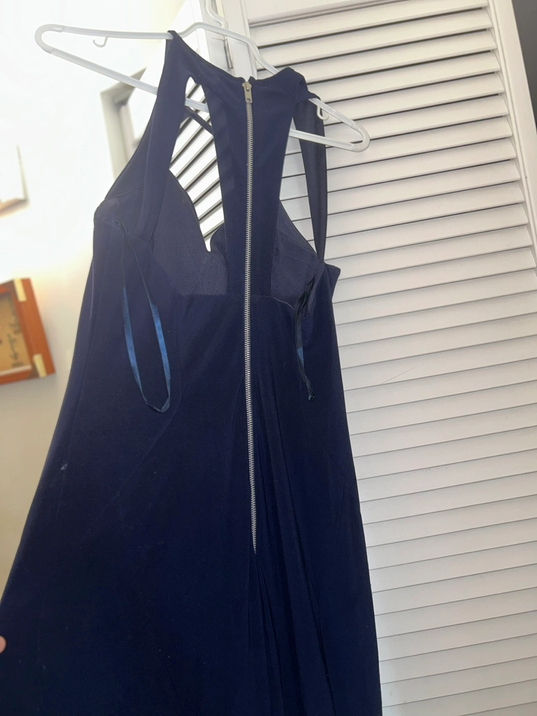 Selling a lovely navy blue halter maxi dress. It's in great condition and perfect for a special occasion! The dress features a unique halter neckline and a flattering silhouette. It has a zipper in the back.