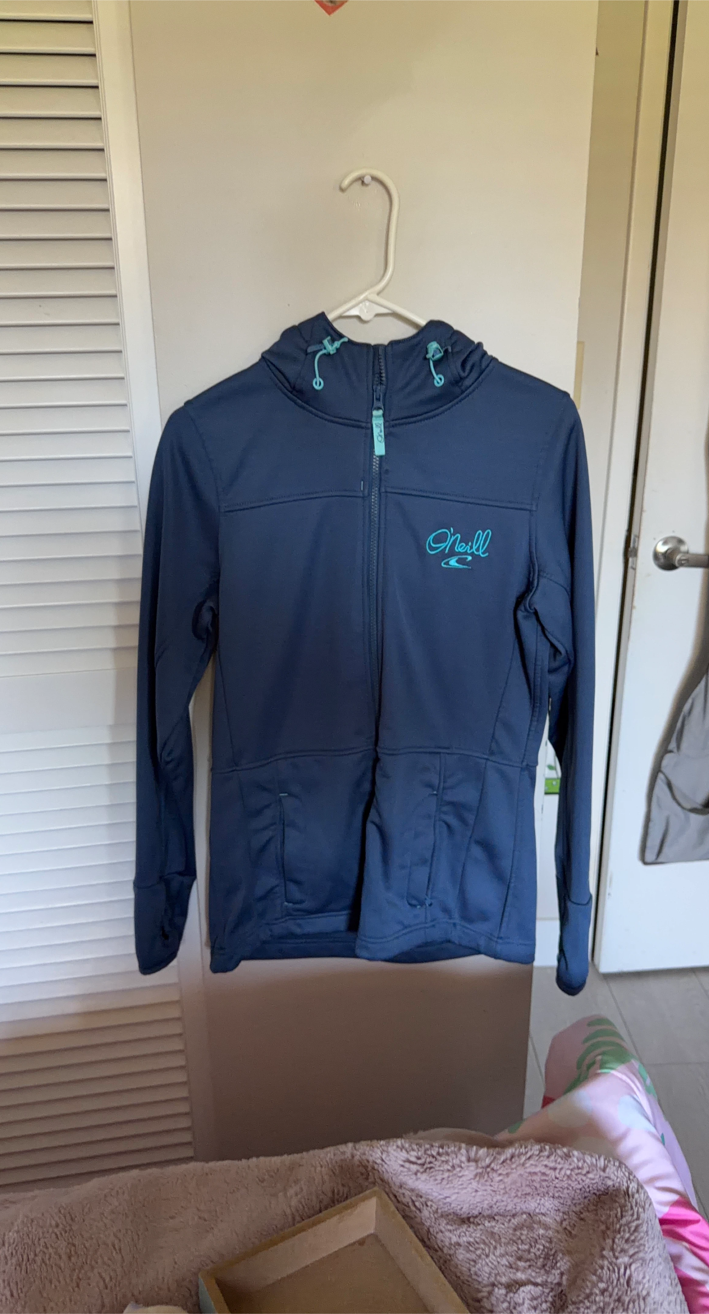 Selling a navy blue O'Neill full zip hoodie. It's in great condition and perfect for layering on cooler days! The hoodie features a full zip closure and the O'Neill logo on the front.