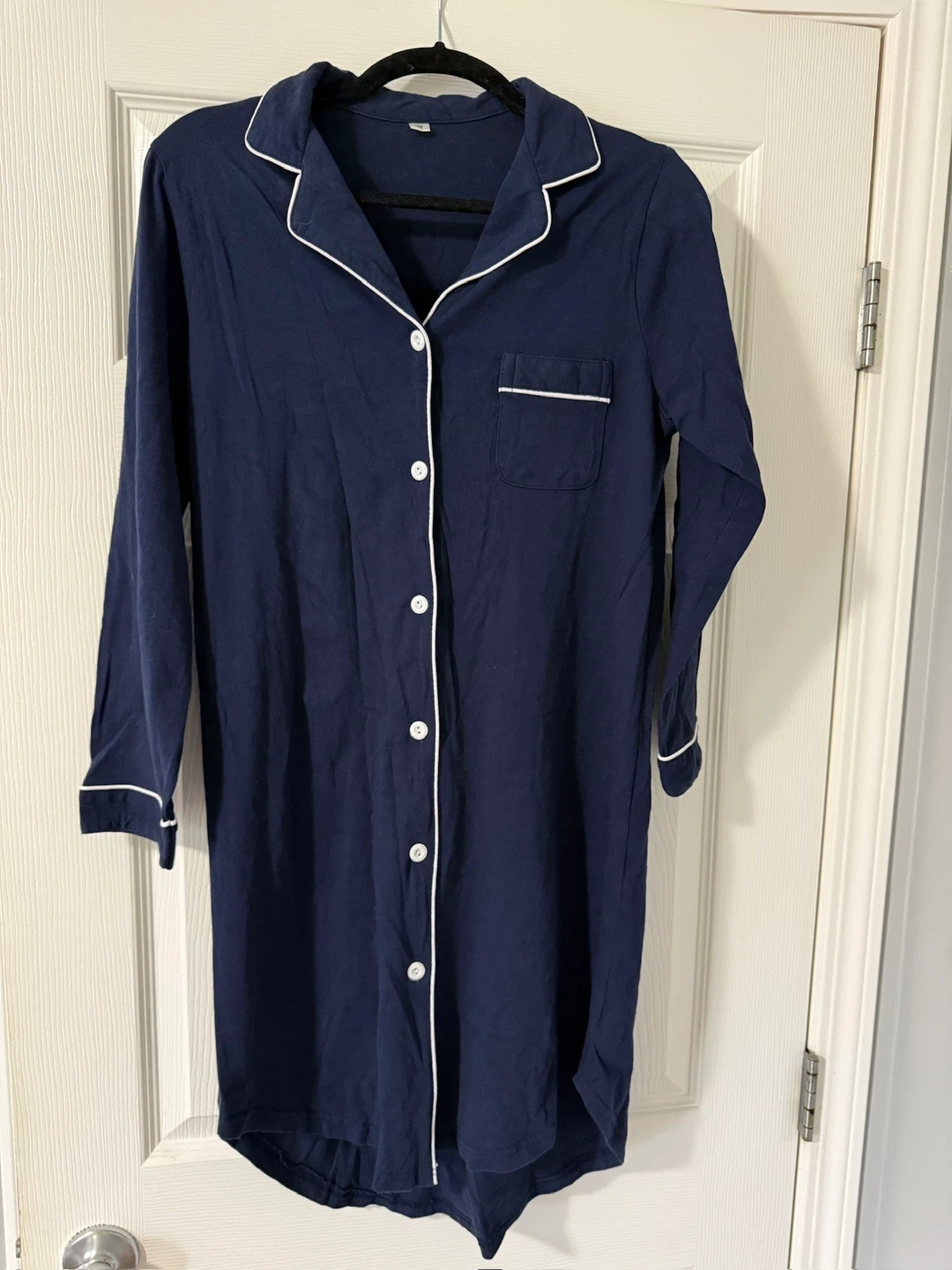 Selling a comfy navy blue pajama shirt dress! It has white piping around the collar, cuffs, and pocket. Perfect for lounging around the house or a casual night's sleep