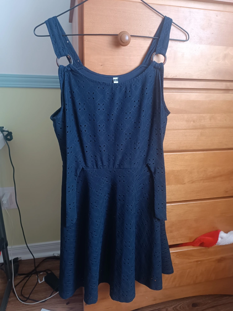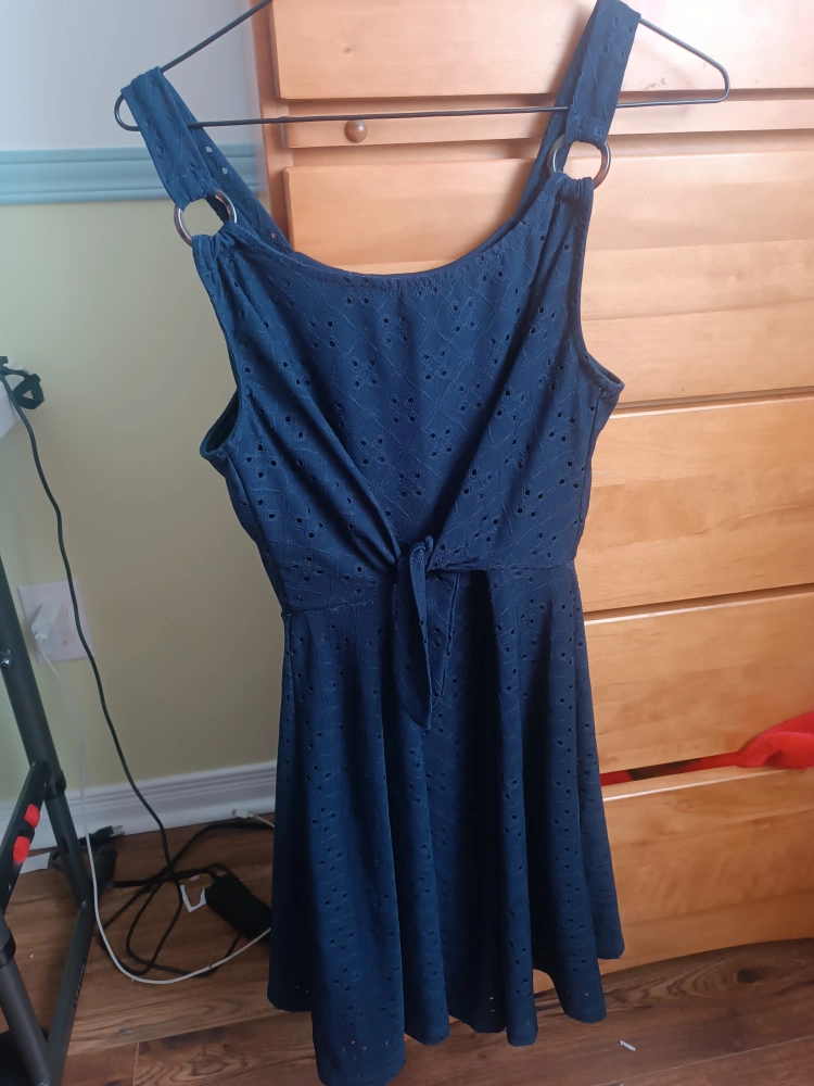 Selling a cute navy blue sleeveless dress in size small. It's in great condition and features a unique eyelet pattern. Perfect for summer!