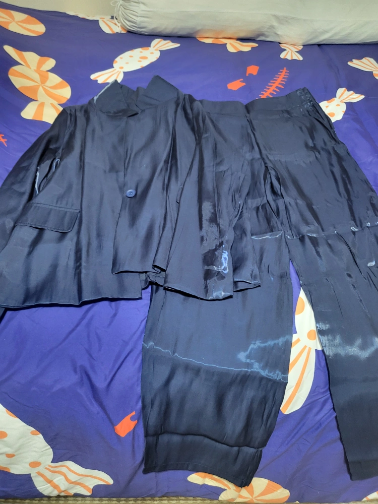 Selling a navy blue two-piece set. It looks to be in great condition and ready for a new home! The material looks silky and smooth, perfect for a night out or a special occasion