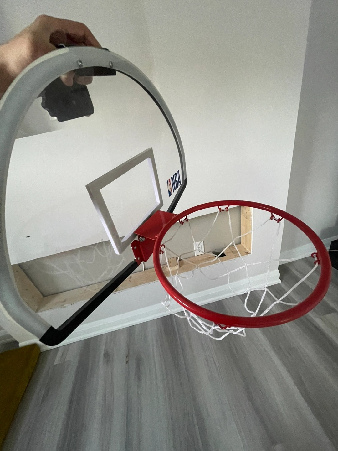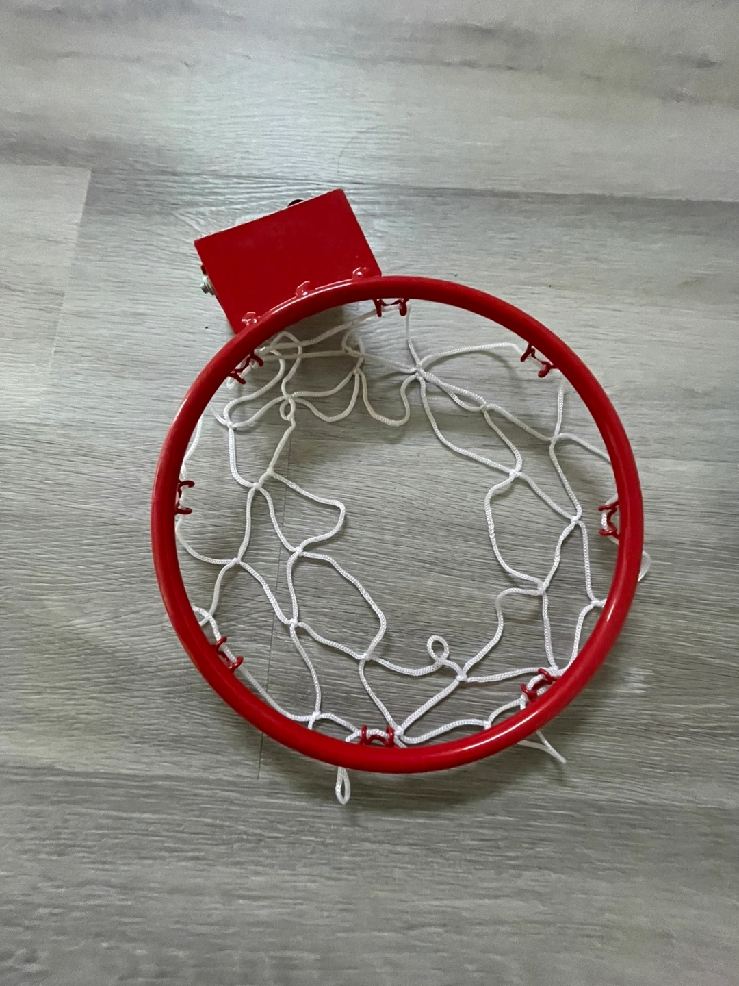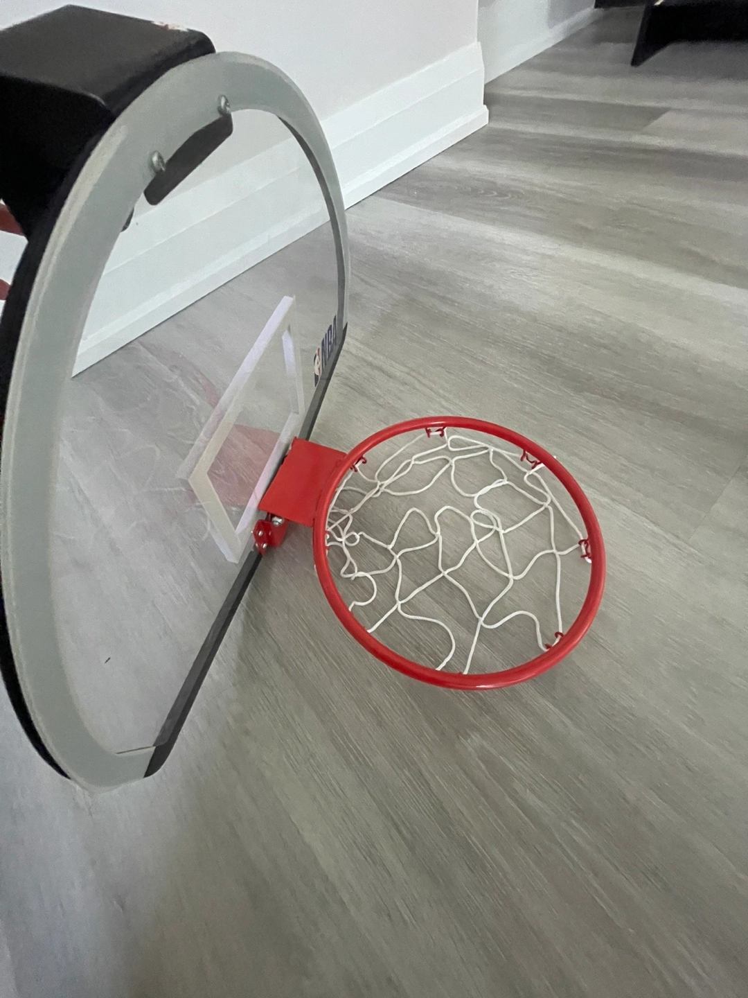 Miniature basketball hoop. Includes backboard and rim. Red rim, clear backboard. NBA logo on backboard.