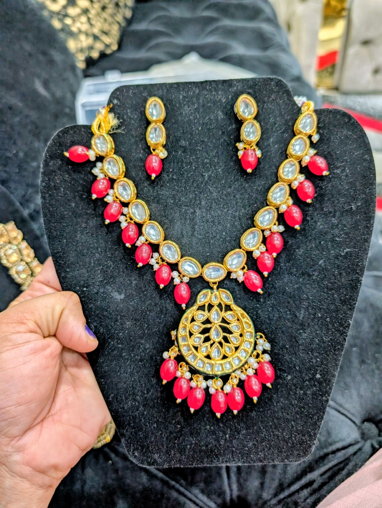 Beautiful necklace and earrings set with red beads and gold-tone accents! This set is perfect for adding a touch of elegance to any outfit. The necklace features a stunning pendant, and the matching earrings complete the look. In great condition and ready to wear