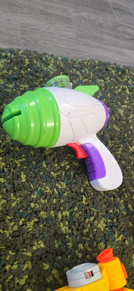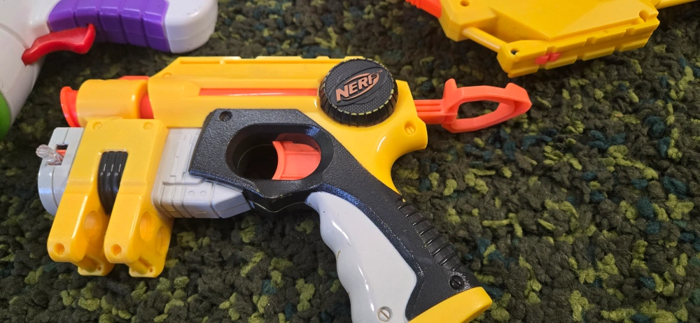 Selling a bundle of Nerf guns! Includes a yellow and orange Nerf gun with rotating barrel and a smaller yellow Nerf gun. Also includes a green and purple toy gun.