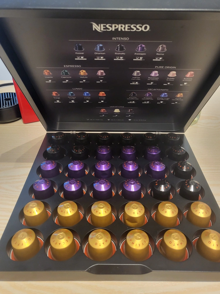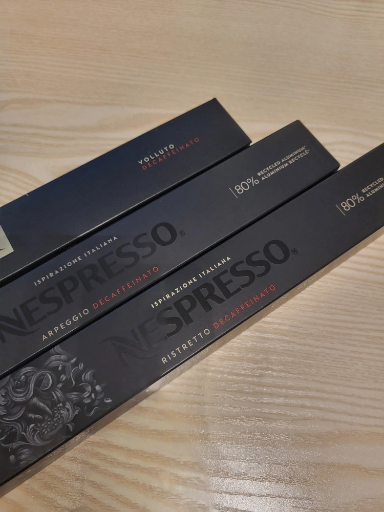Selling a variety of Nespresso coffee capsules, including Arpeggio Decaffeinato, Ristretto Decaffeinato, and Volluto Decaffeinato. Also included is a red Nespresso coffee machine. Perfect for your morning brew!