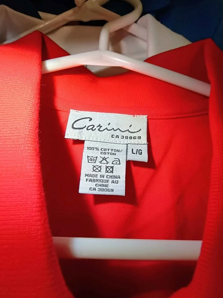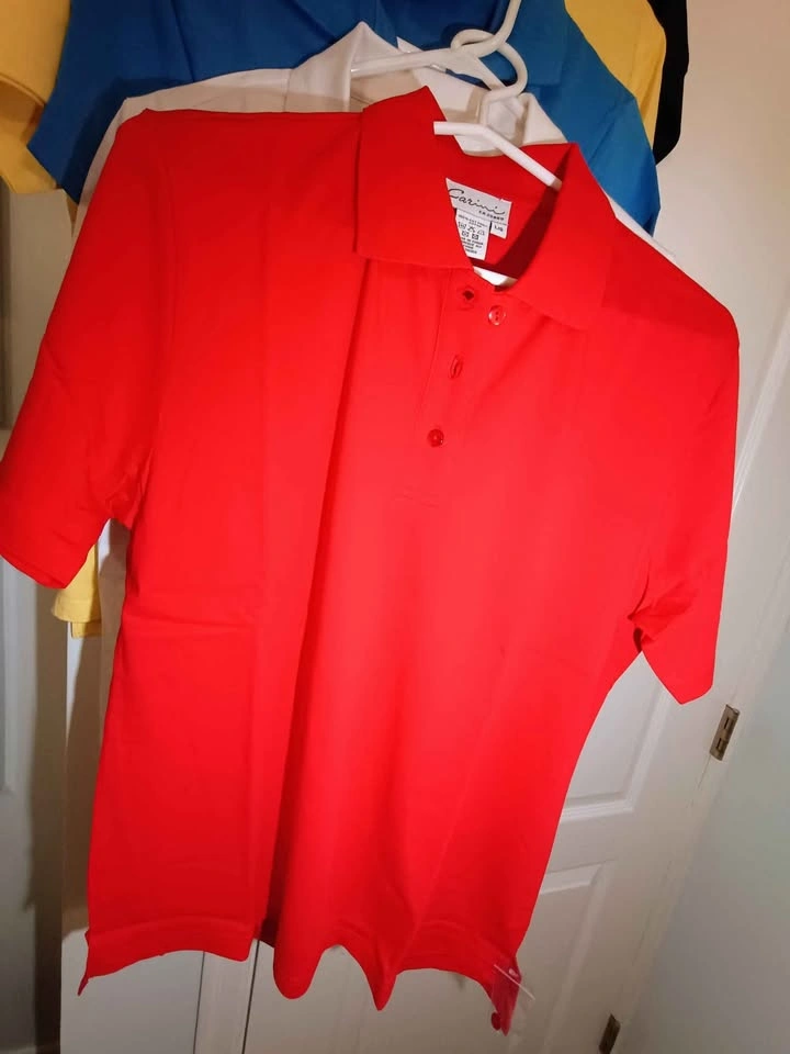 100% cotton, good quality shirts. 3 types: 1. Polo style 2. No buttons, short sleeve 3. No buttons, 3/4 sleeve $6 each pick up in Southeast Vancouver near Victoria Dr and 60th Ave Most are available in red, white, blue, yellow & black and following sizes Sizes S - 17" width, 23.5" length M - 18" width, 24.5" length L - 20" width, 25" length XL - 21" width, 25.5" length Best to get 1 size larger to accommodate any shrinkage since its 100% cotton