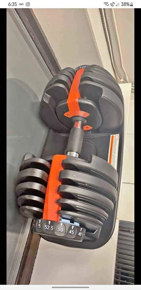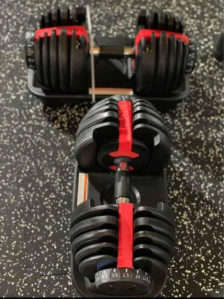 IN STOCK!!! Brand New Adjustable Dumnbells. Very similar to the Bowflex 552. Easy to use with 15 different weight settings. Each Dumbbell adjusts from 5lb-52.5lb (Weights shown in lbs NOT Kg). Selling as pairs only, brand new in the box. Great space saver, much more affordable than the rubber Hex Dumbbells, great for home gyms, condos etc. Comes in 2 colours: Black with red accent. Stands available sold separately. -Pair of dumbbells $250 (2 Dumbbells) -Stand $150 (sold separately) Buy a set and stand and get $50 off. Serious inquiries only!