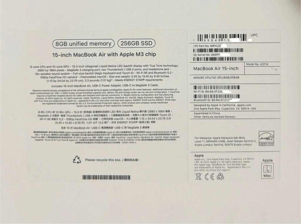 Selling a brand new MacBook Air 15-inch with the M3 chip and 256GB storage! It comes in the original box. Key features: - 8GB unified memory - 256GB SSD storage - 15-inch Liquid Retina display with True Tone technology - Two Thunderbolt / USB 4 ports, and headphone jack - Backlit Magic Keyboard and Touch ID - Wi-Fi 6E and Bluetooth 5.3 - 1080p FaceTime HD camera It's lightweight and portable, making it perfect for on-the-go use
