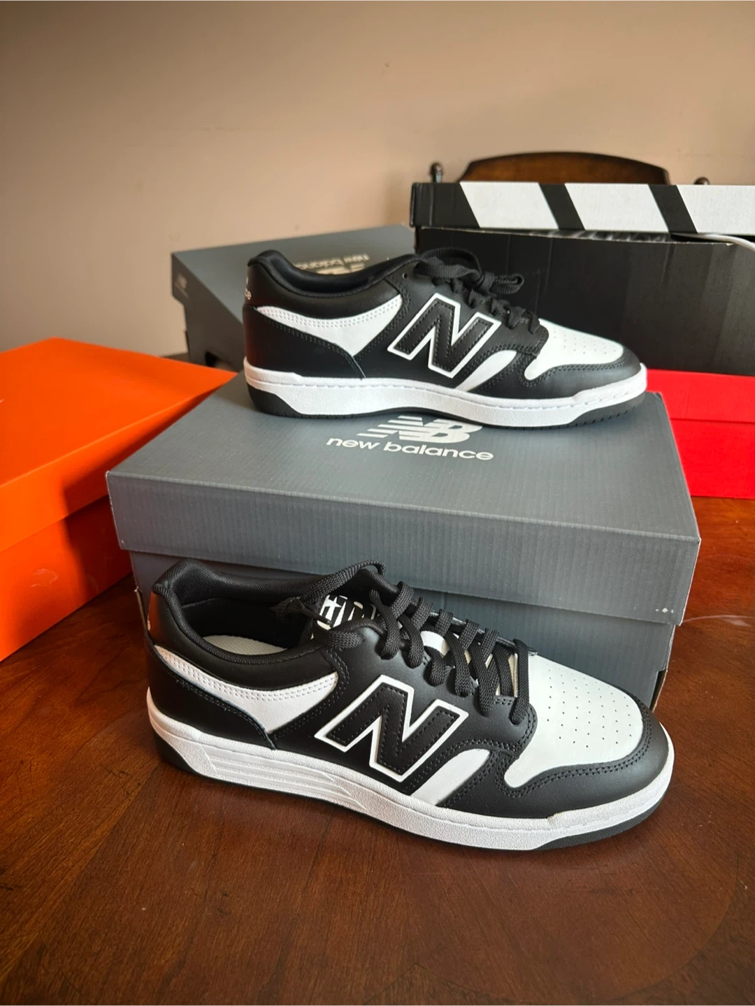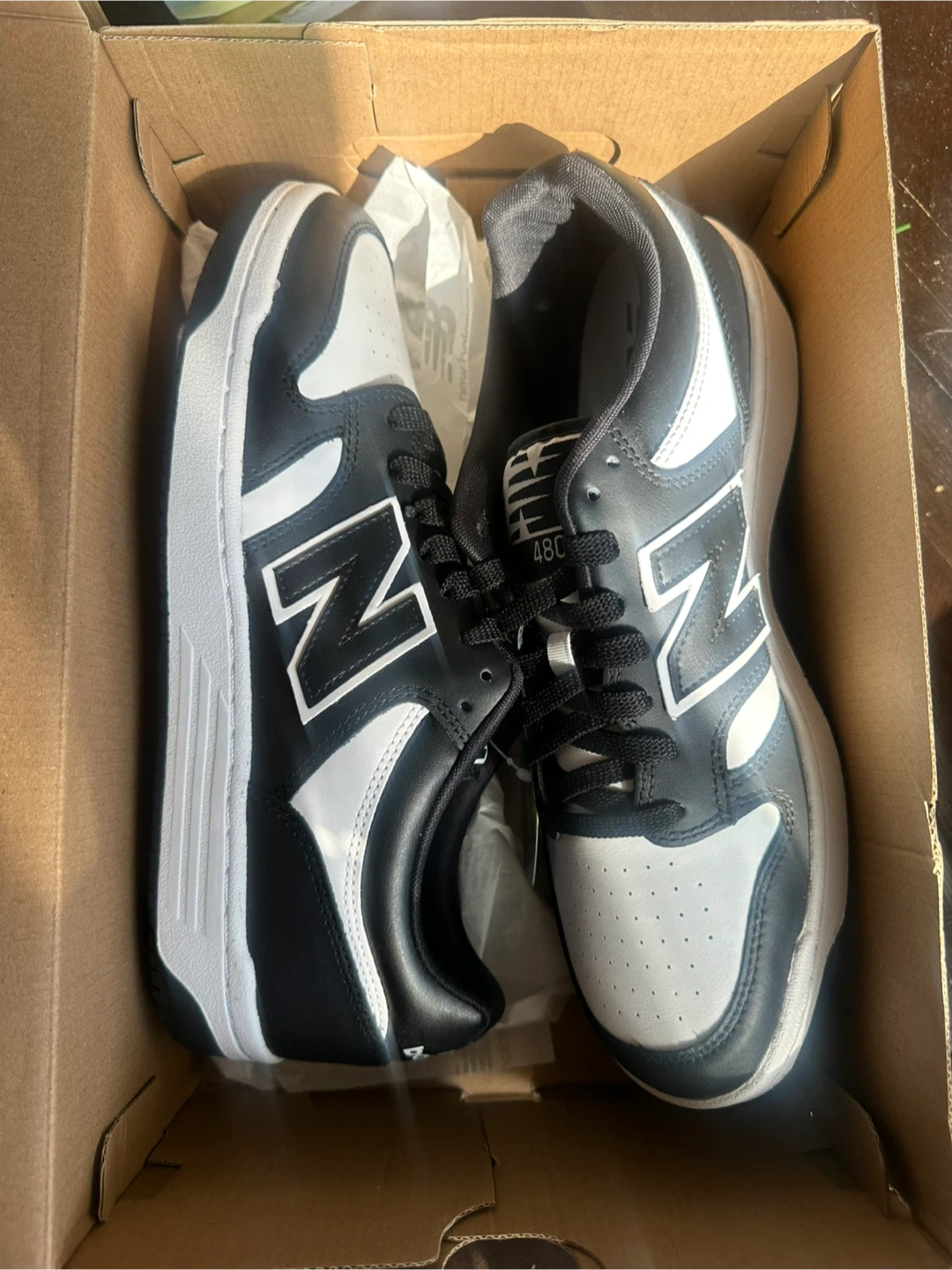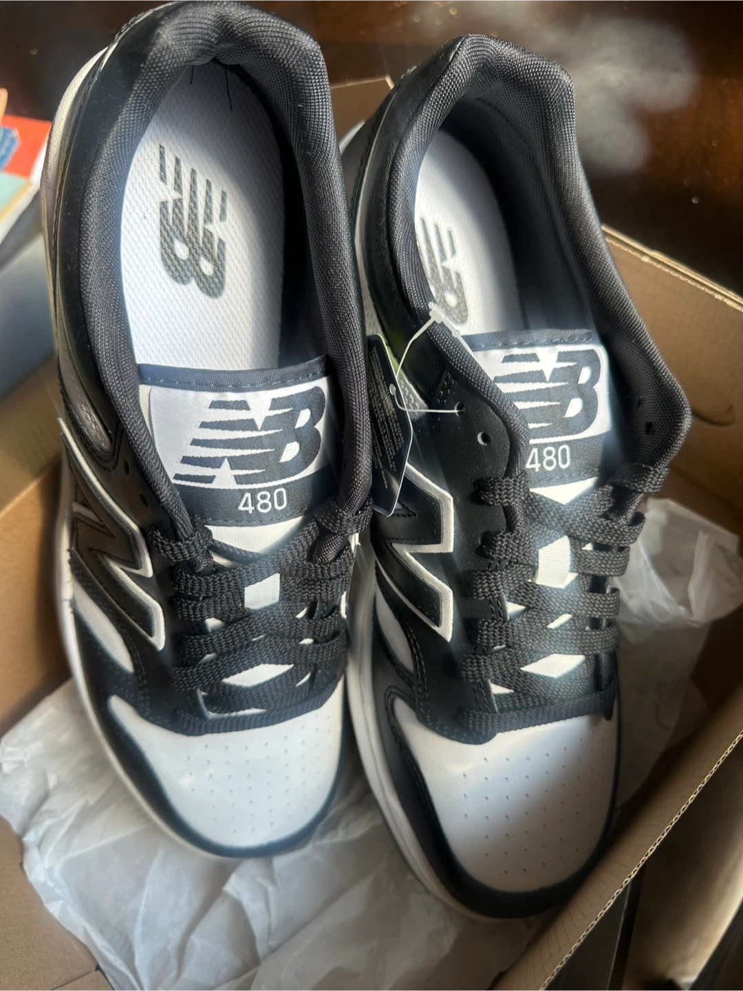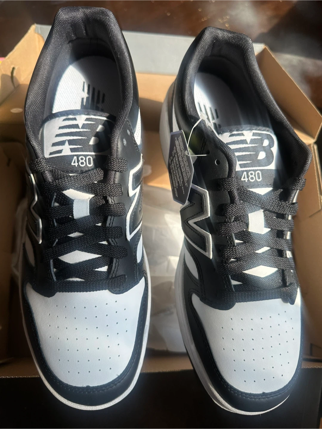 Selling a pair of New Balance 480 sneakers in black and white. They come with the original box. These are in new condition and ready for a new home!