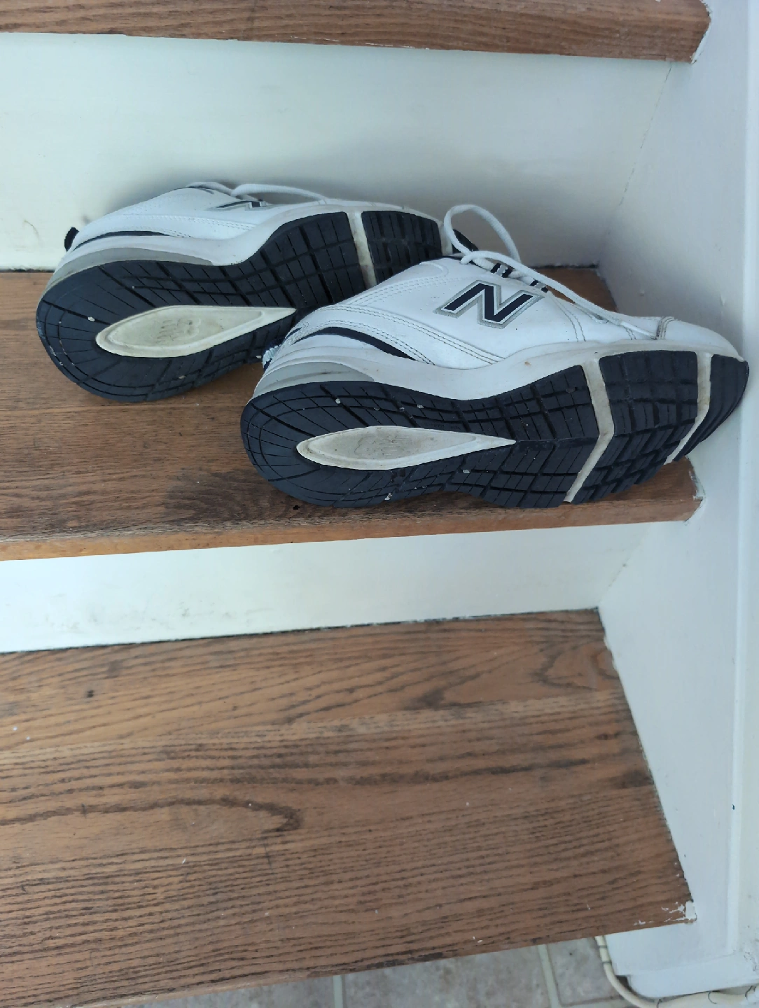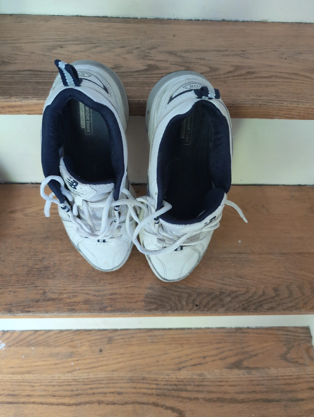 Selling a pair of New Balance 608 sneakers in white. They show signs of wear, as you can see in the pictures. The size is US 7. These are great for everyday wear! Valued at $35