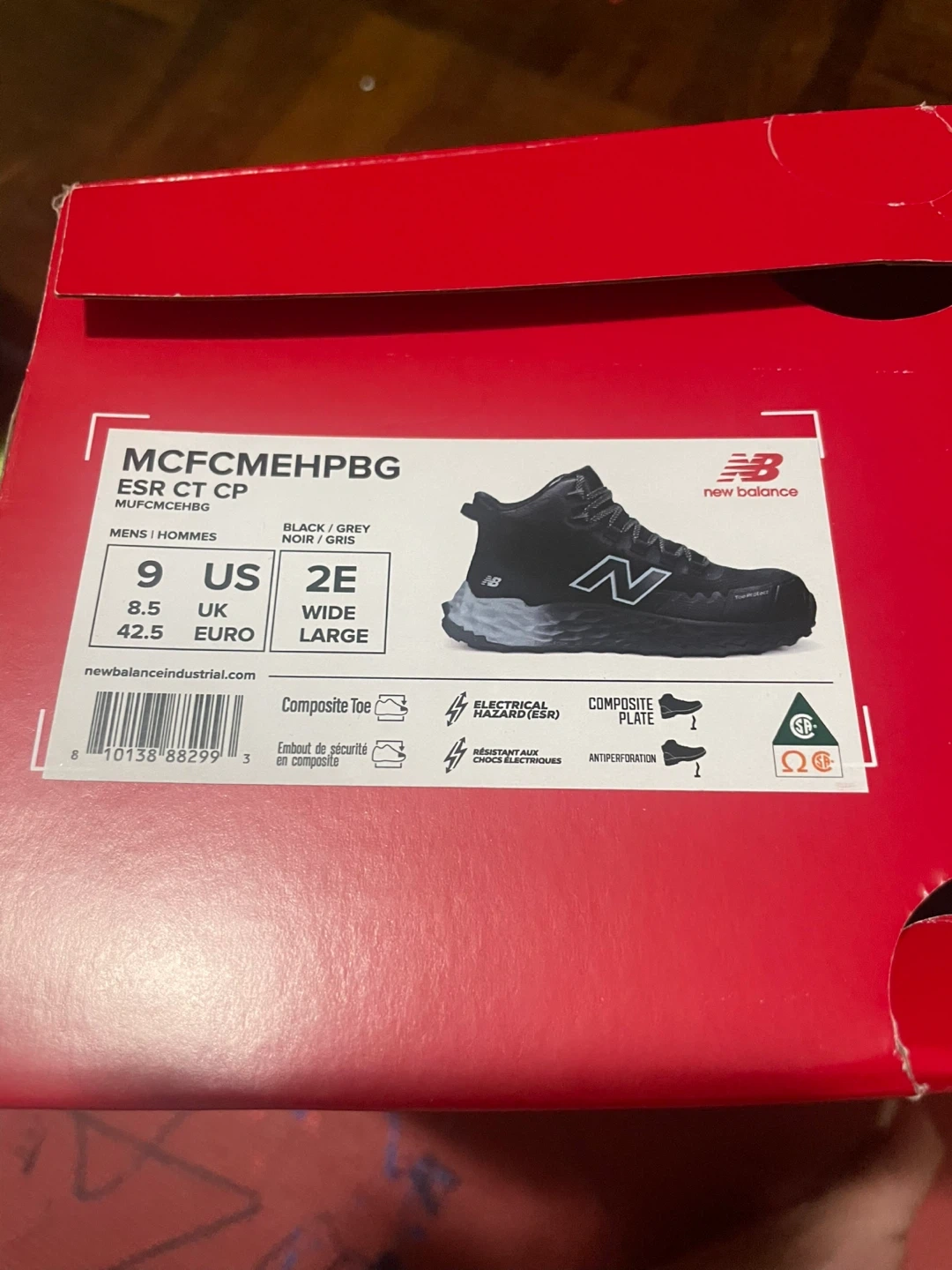 Selling a pair of New Balance MCFCMEHPBG ESR CT CP boots in size US 9. These are black/grey and wide/large (2E). They feature a composite toe and composite plate for safety, and are electrical hazard resistant. The soles are in great condition and the original box is included!