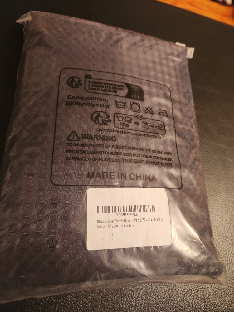 I'm selling a brand new black shower curtain with hooks, still in its original packaging! It's made of 100% polyester and measures 72 x 72 inches. A simple and stylish addition to any bathroom
