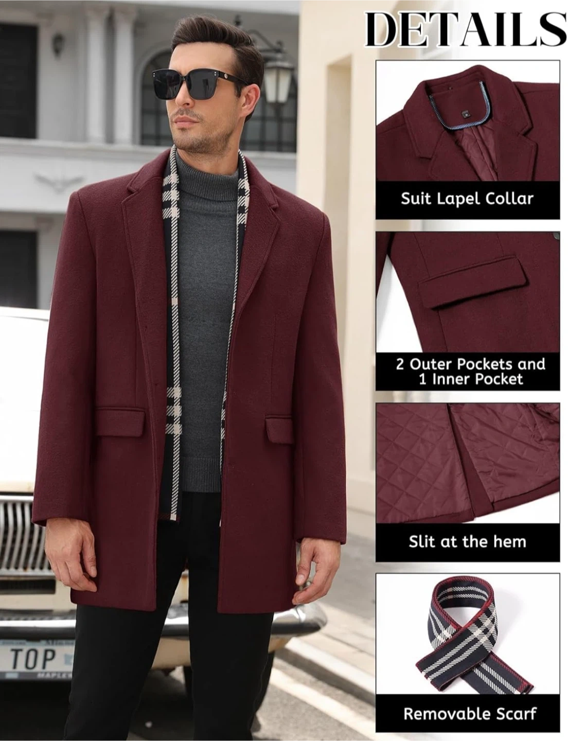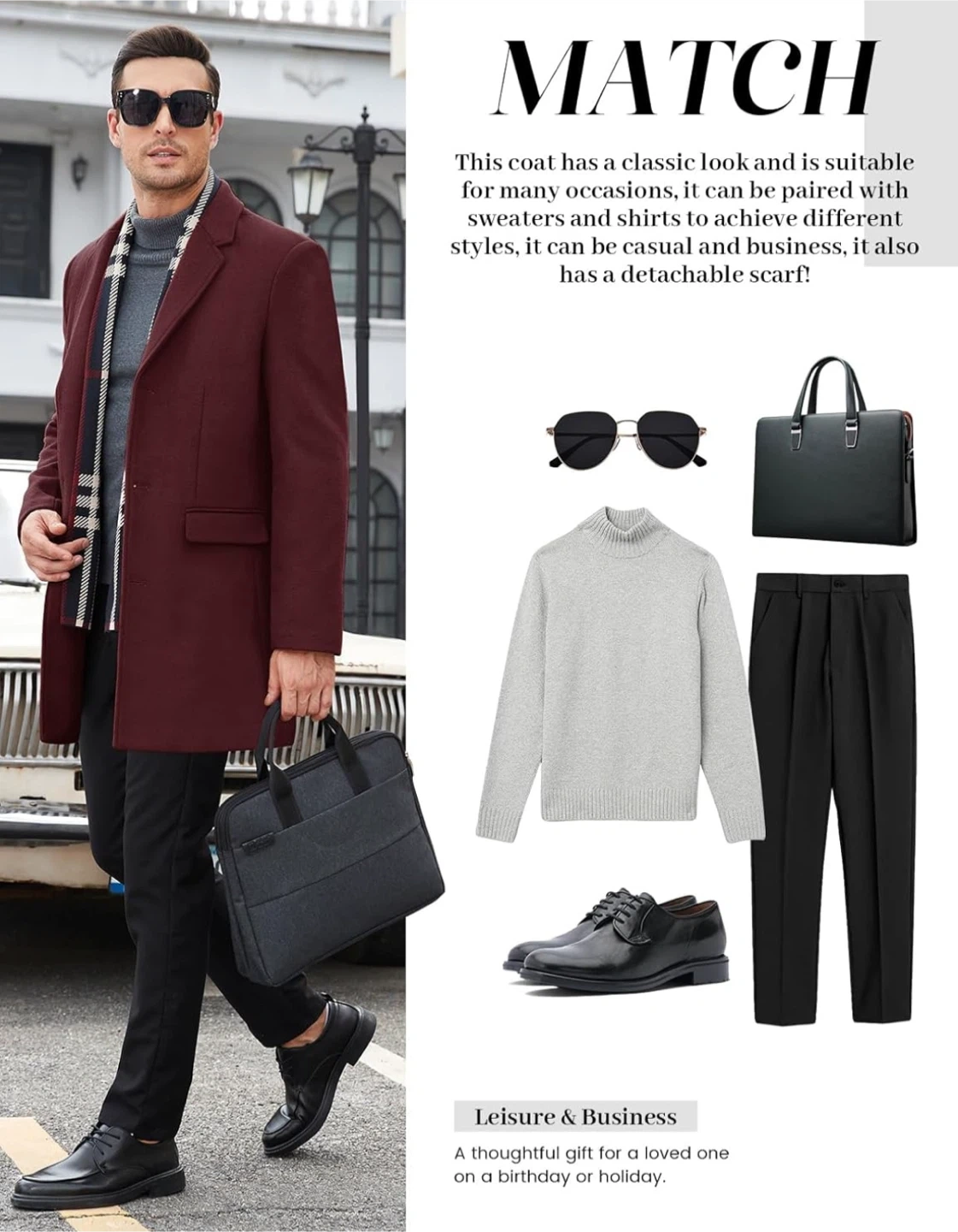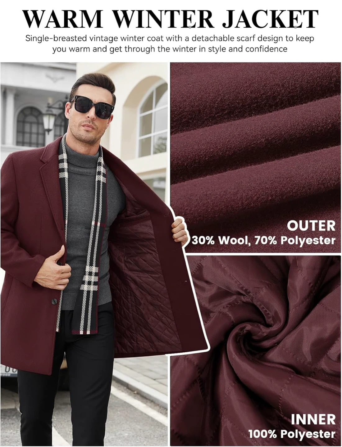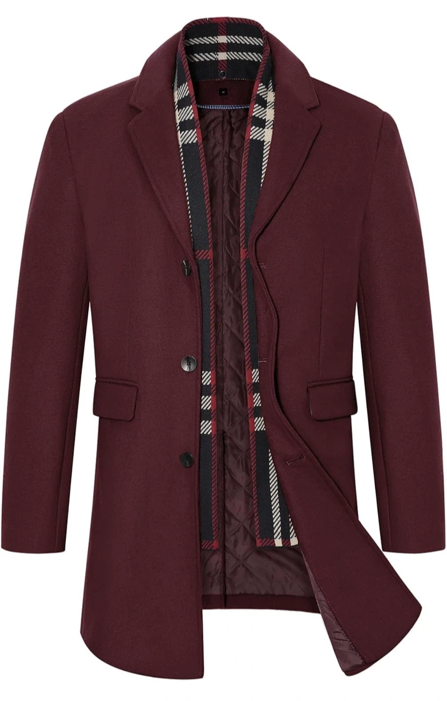 Keep warm this winter with this stylish burgundy jacket! It's a single-breasted vintage winter coat with a detachable scarf design. The outer layer is made of 30% wool and 70% polyester, and the inner lining is 100% polyester. It features a suit lapel collar, two outer pockets, one inner pocket, and a slit at the hem. The removable scarf can be worn to keep you cool or warm Fabric type Outer:30% Wool,70% Polyester. Inner:100% Polyester. This garment is made of high quality wool, which provides you with extreme warmth and comfort. Good warmth:The coat is thick and made of wool and other high-grade fabrics, which can effectively insulate the outside world from cold air and keep the wearer's body warm, while the lapel design can to a certain extent protect the neck from the cold wind. Unique design: The design of the jacket is simple and unobtrusive, without too many decorations and patterns, but designed with practicality in mind. Not only does it come with two pockets on the outside, but also on the inside, which is very practical without affecting the appearance of the clothes. These pockets can place some commonly used small items, such as handkerchiefs, keys and so on. Convenient and practical: The coat is paired with a removable plaid pattern scarf on the inside, which is easy for you to take off and match according to different occasions and moods. While improving the warmth, it also adds highlights and layers to the overall look. Fashionable and Versatile: This coat is designed to meet the needs of formal occasions, highlighting the professionalism and elegance of the wearer; it can also be easily integrated into casual wear, whether it is paired with jeans or slacks, whether it is paired with a hoodie or a sweater, it can present a different style. Its versatility makes it an indispensable closet piece.