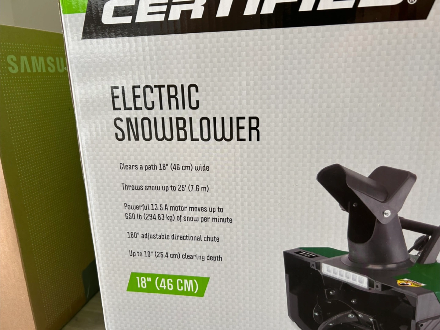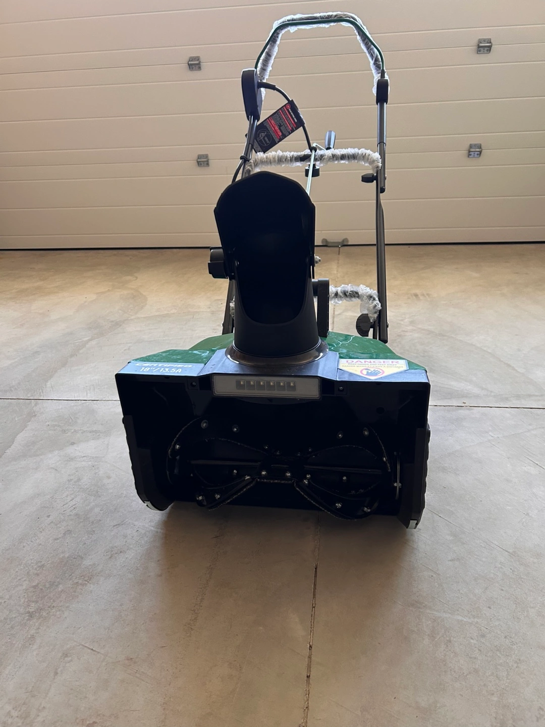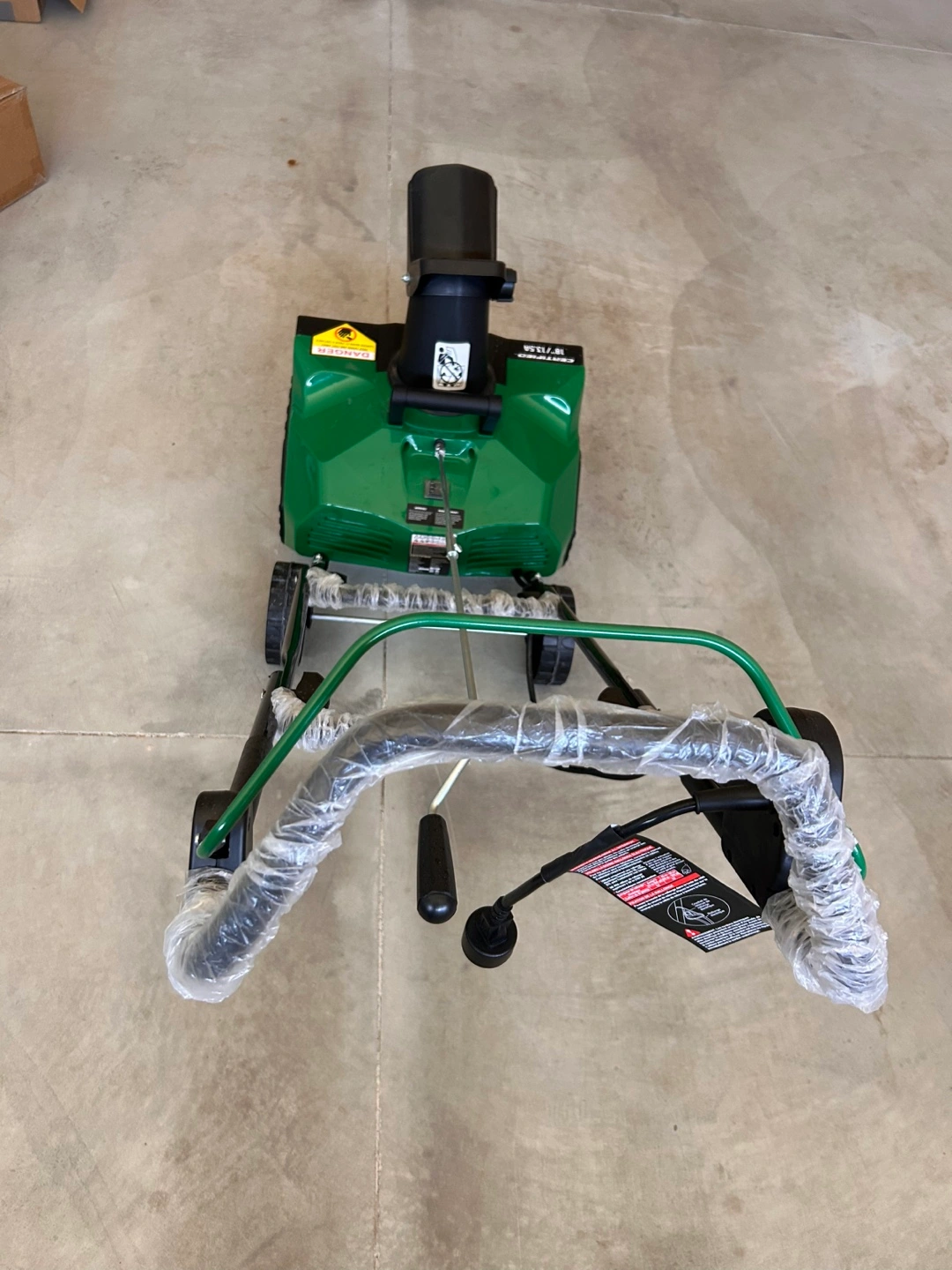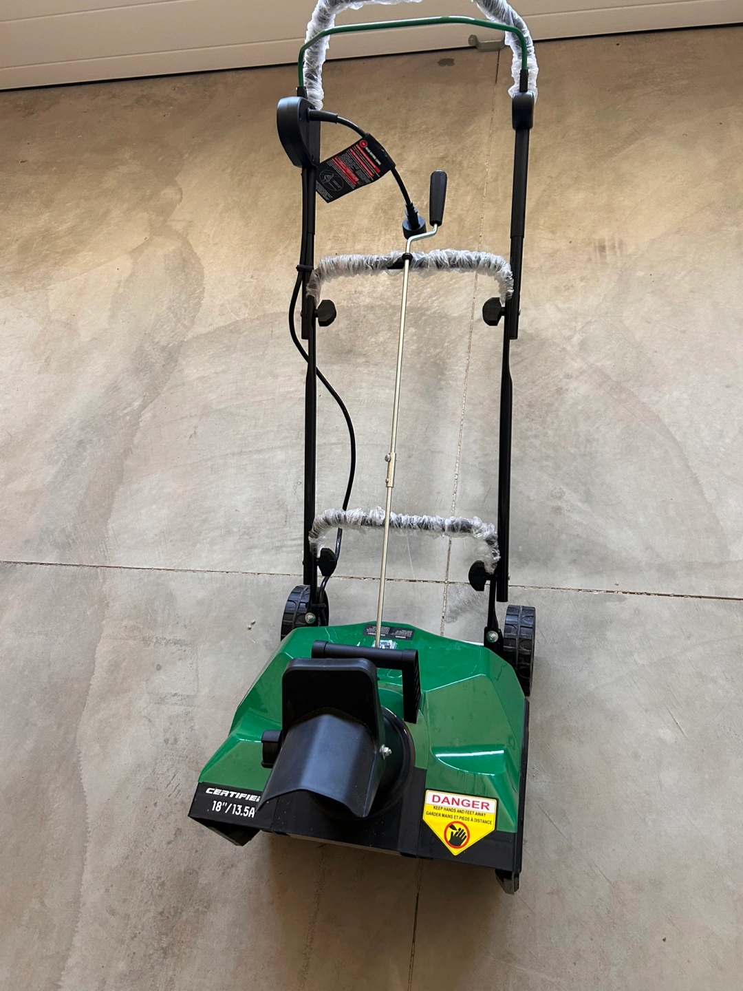 Electric snow thrower. 18 inch clearing width. New, in original packaging. Some plastic wrapping still on the handles.