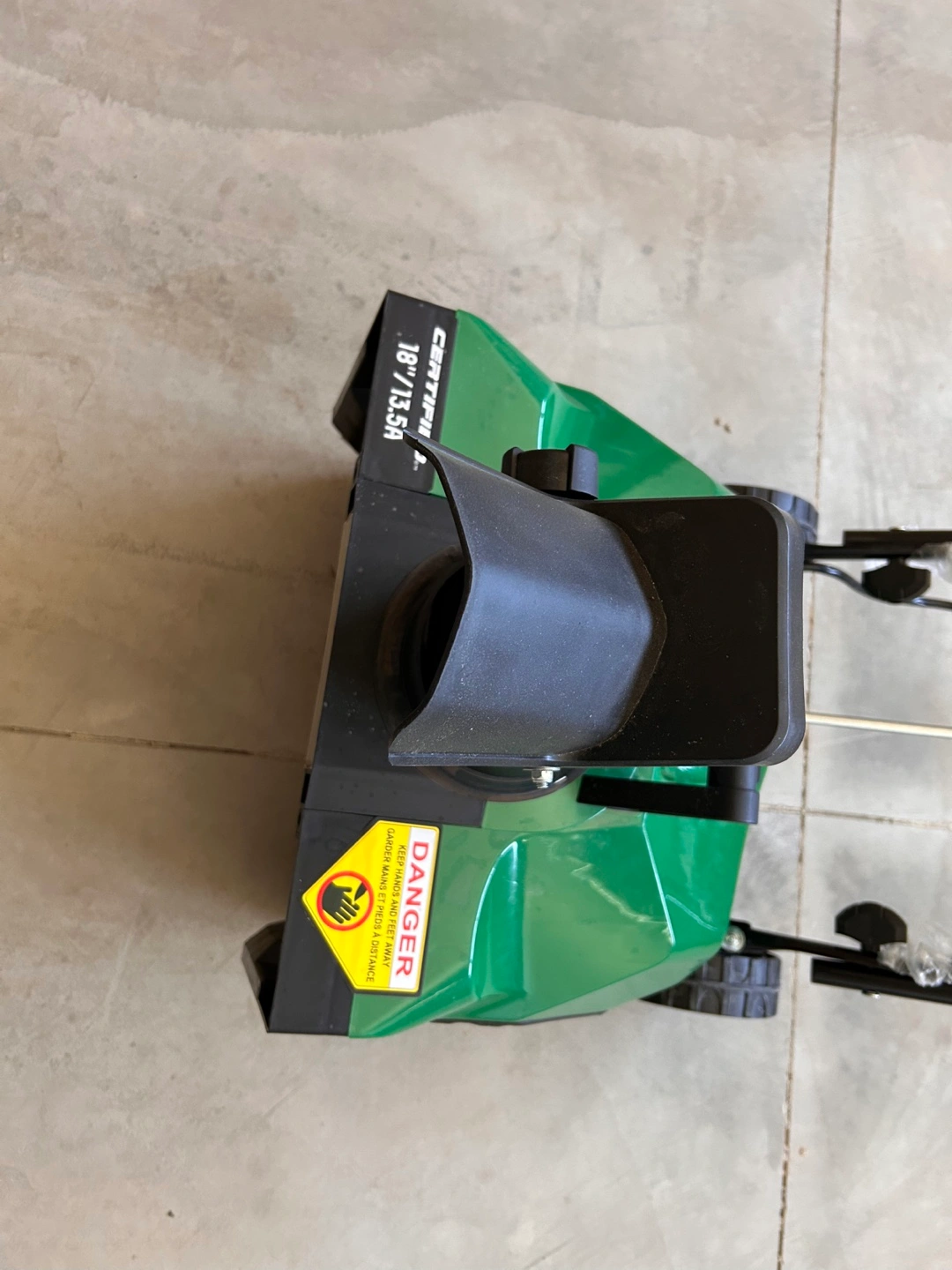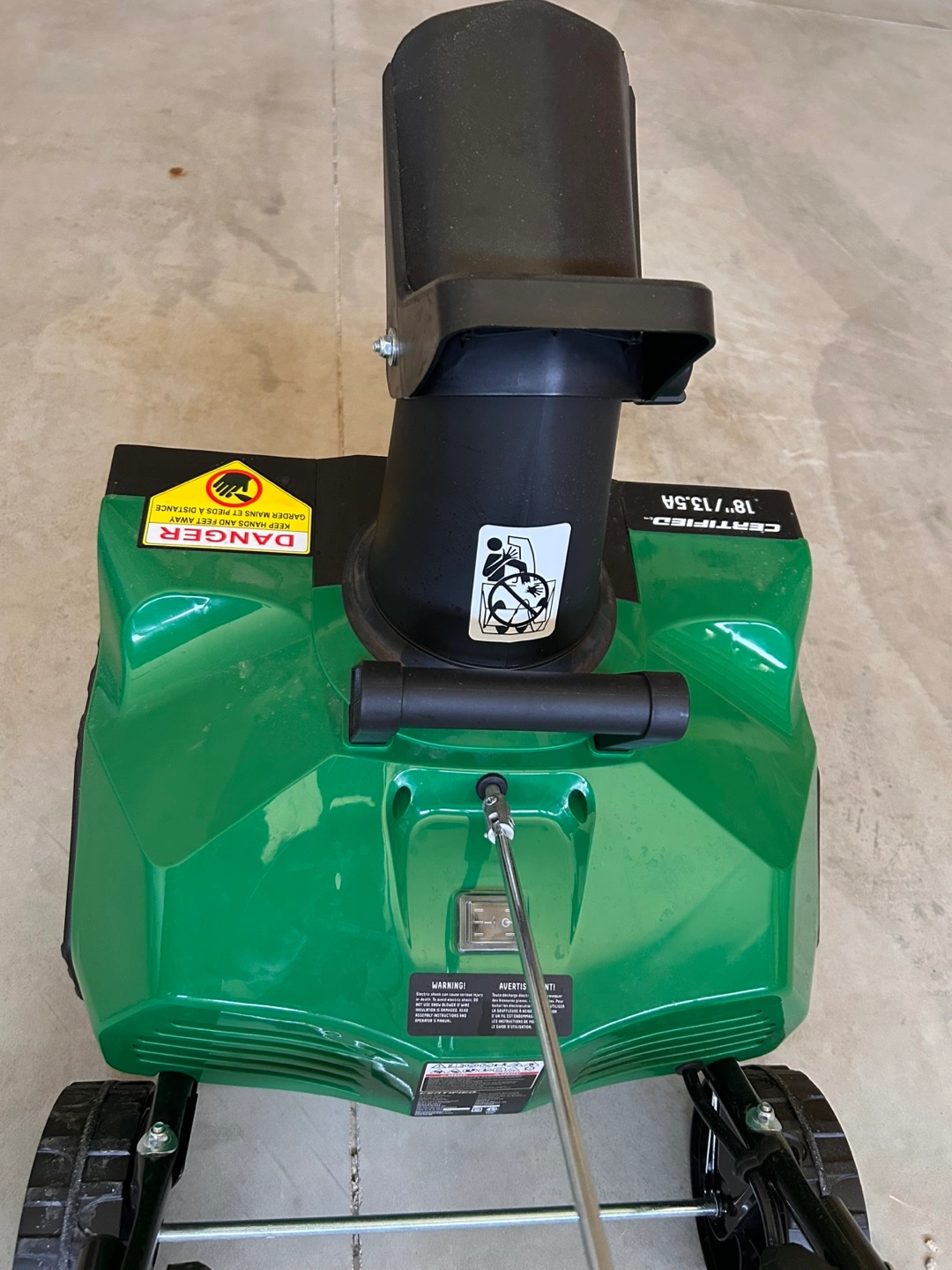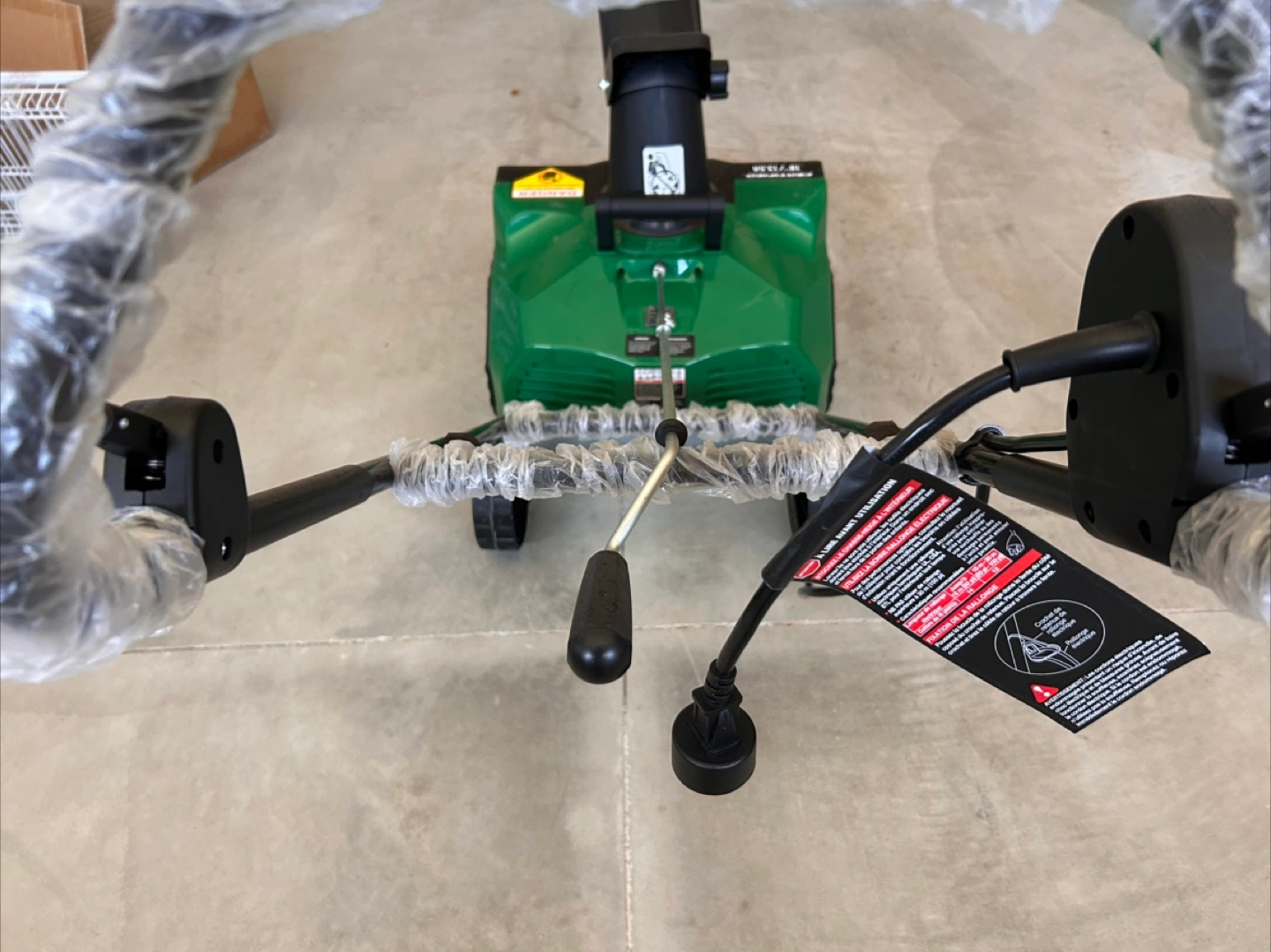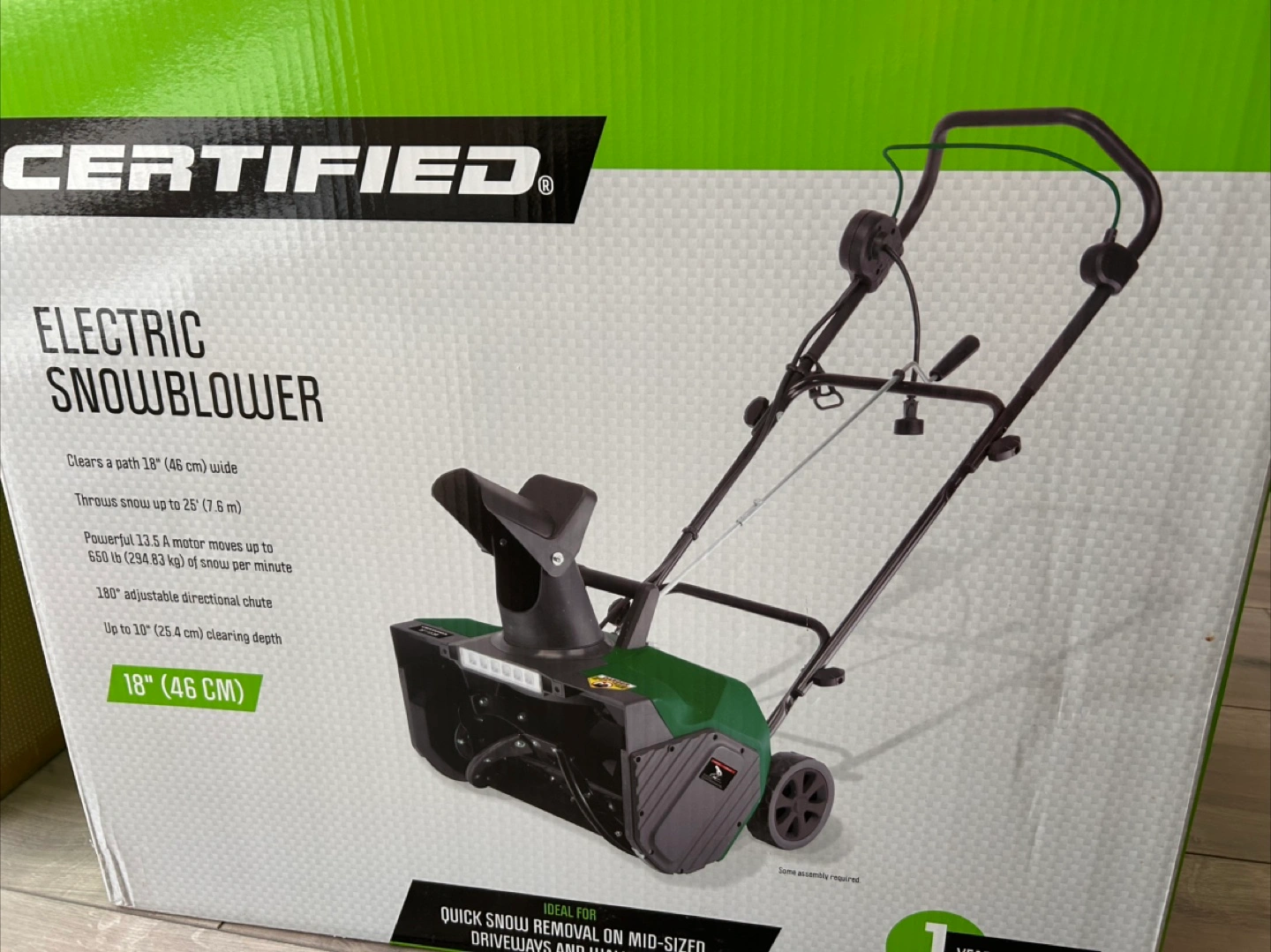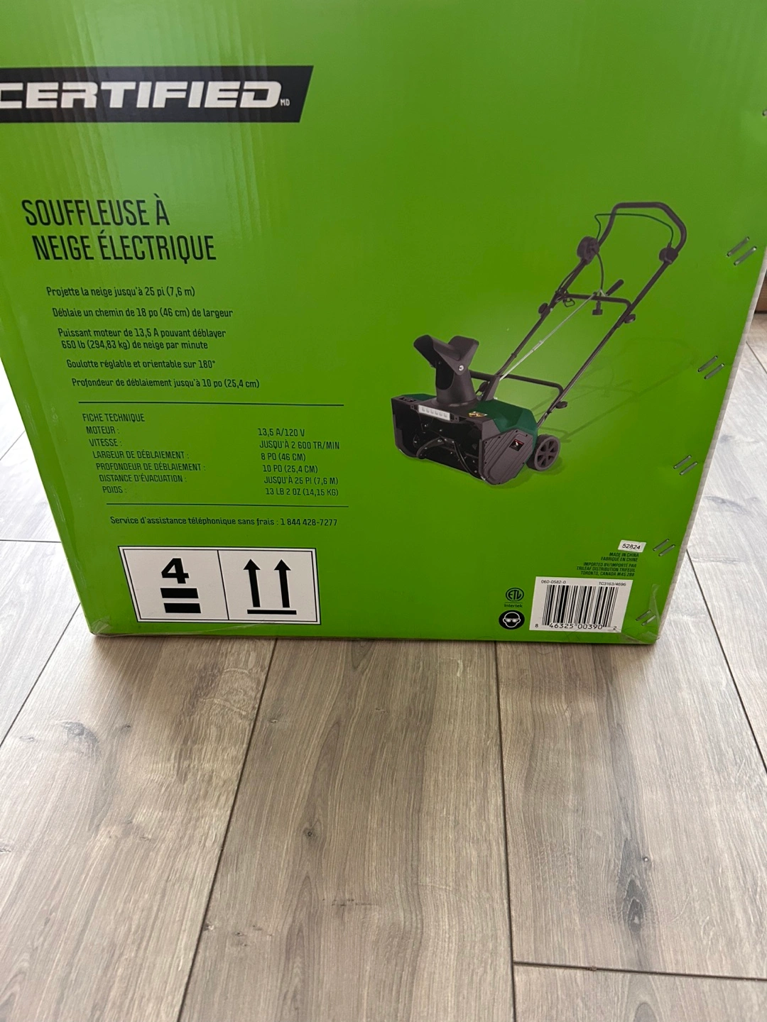 Electric snow thrower. 18 inch clearing width. New, in original packaging. Some plastic wrapping still on the handles.