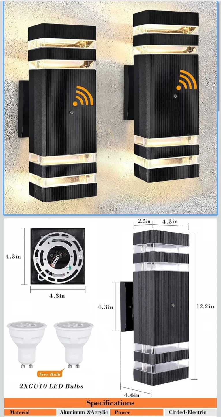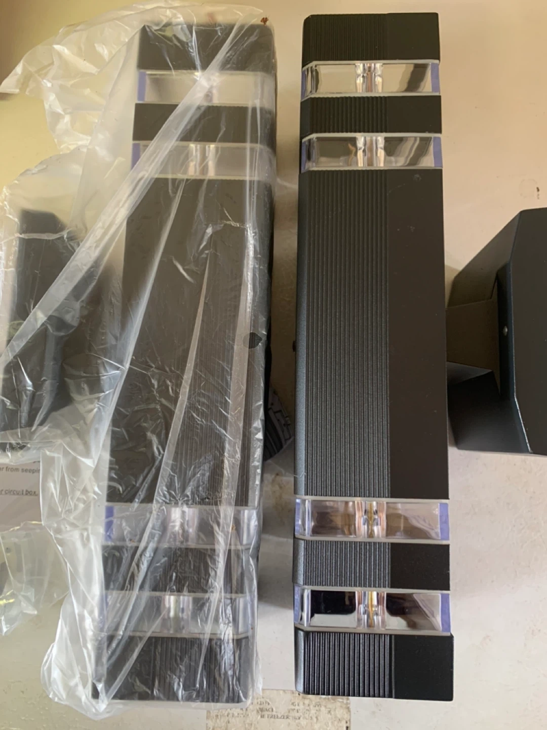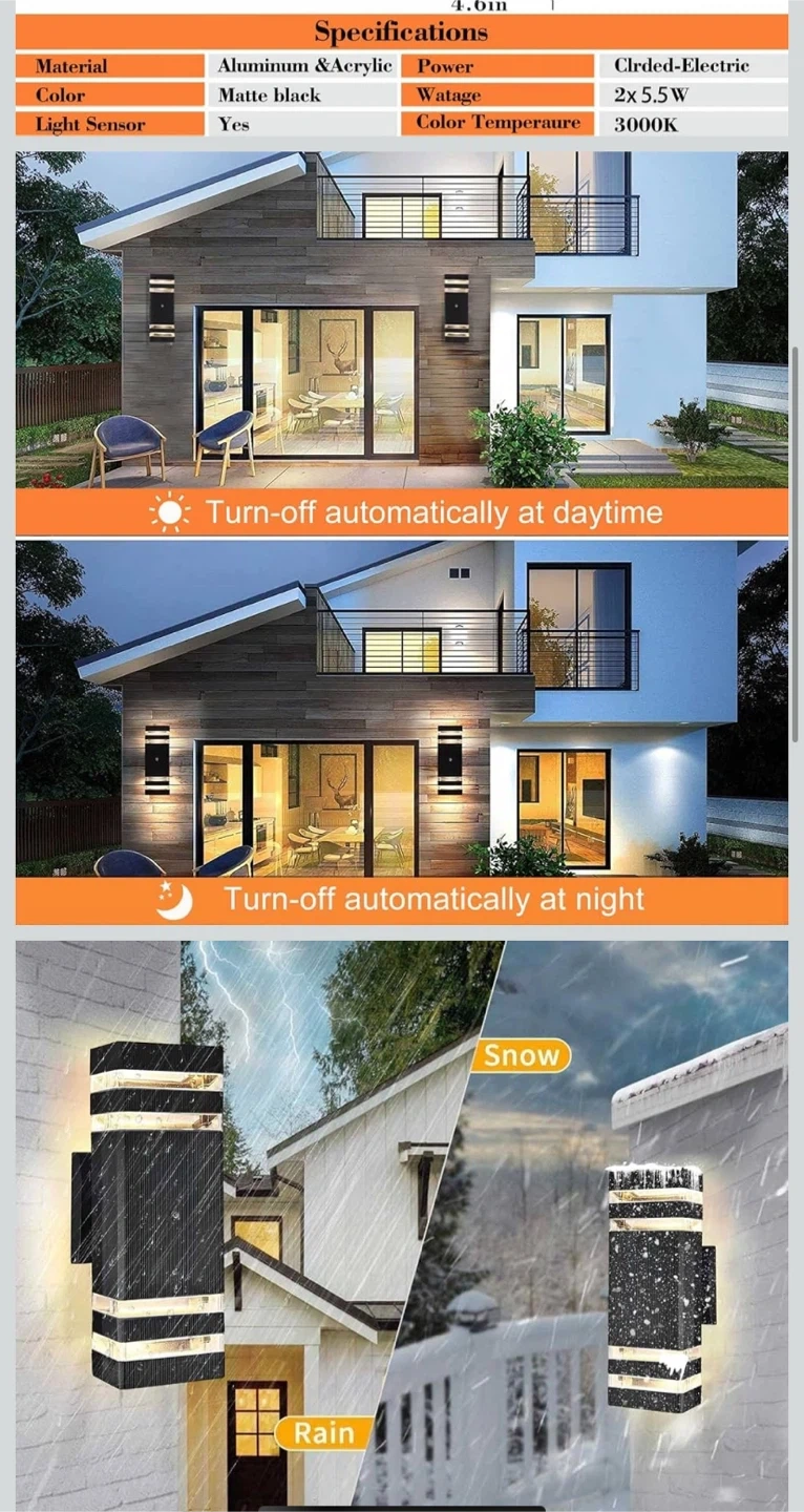 Selling a new outdoor wall light in matte black! - Material: Aluminum & Acrylic - Power: 2x 5.5 W - Has a light sensor that turns off automatically at daytime and turns on automatically at night - Can withstand rain and snow Assembly and installation instructions are included