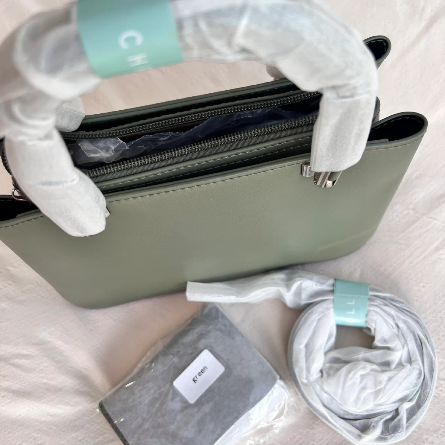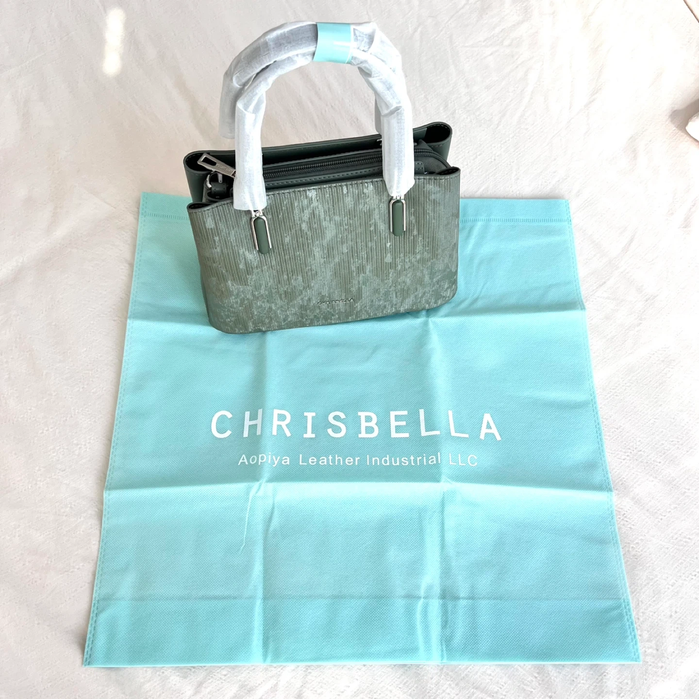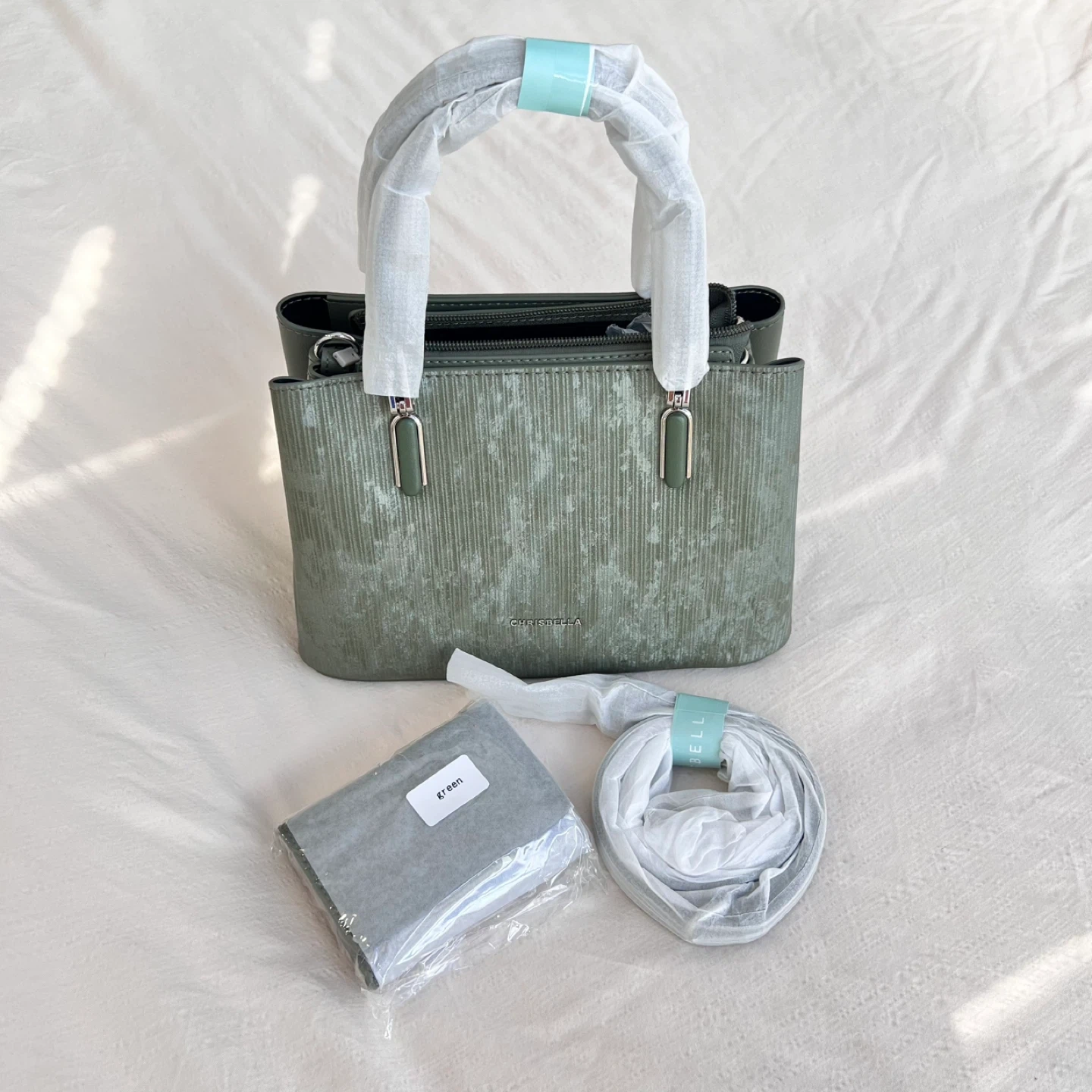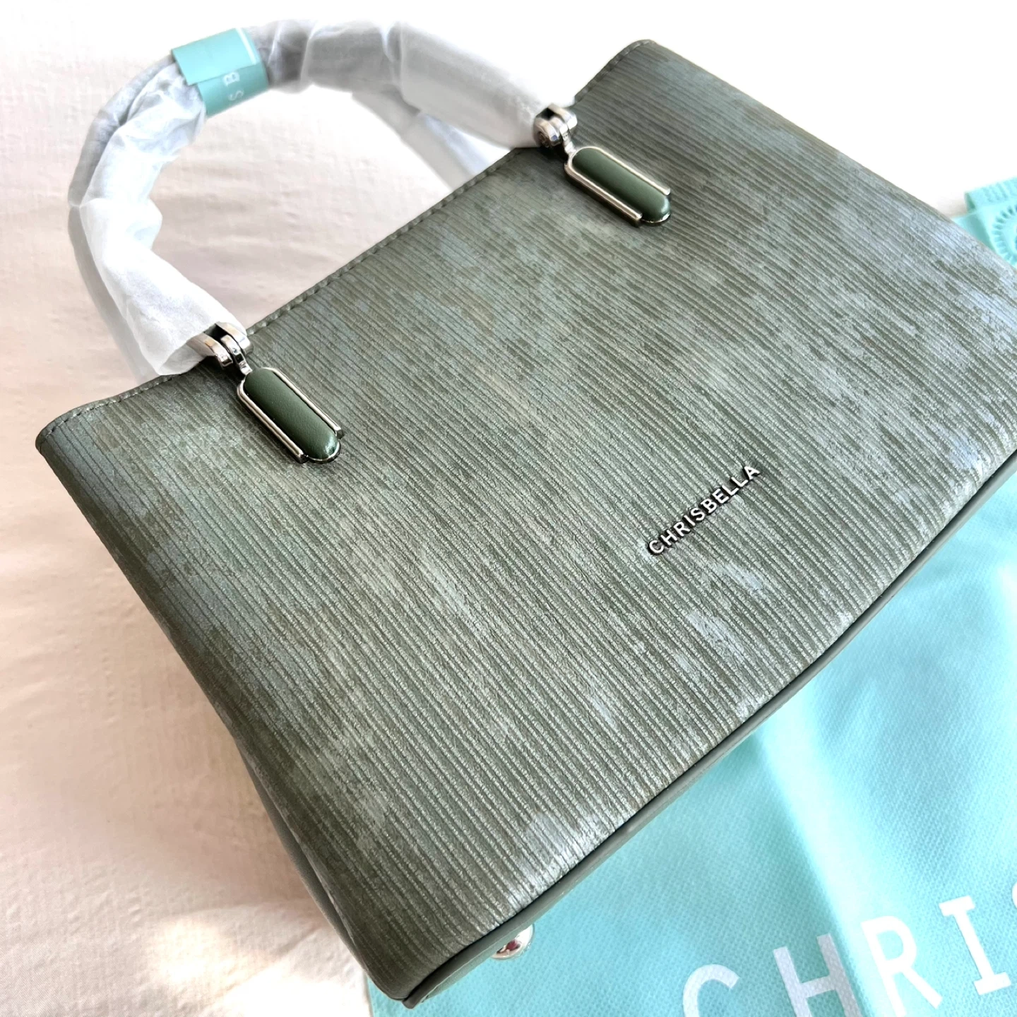 Size:22*17*11(cm) Selling a brand new Chrisbella handbag in a lovely green colour! It comes with its original dust bag and shoulder strap. Never been used and ready for a new home! ⚠️Please note: The marks visible on the bag are not dirt or scratches—they are part of the original gradient colour design, giving the bag a unique and stylish look.