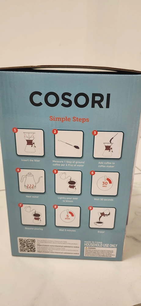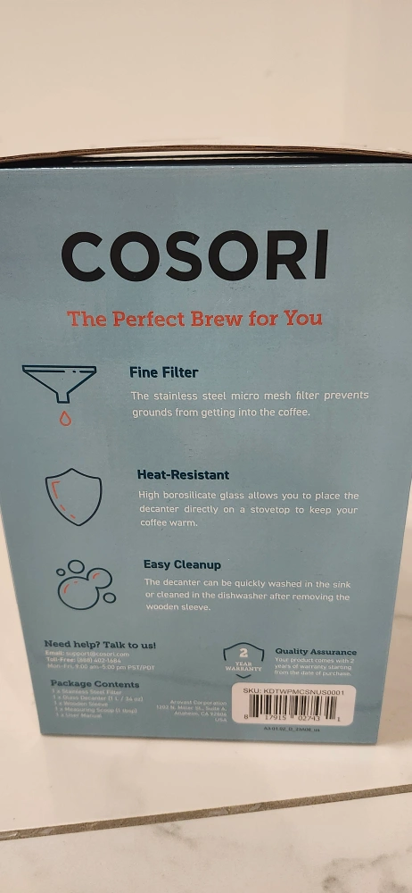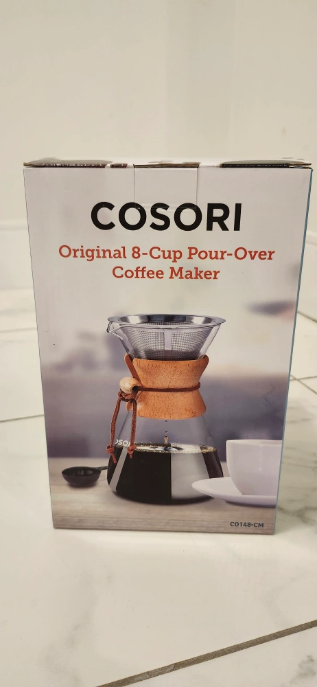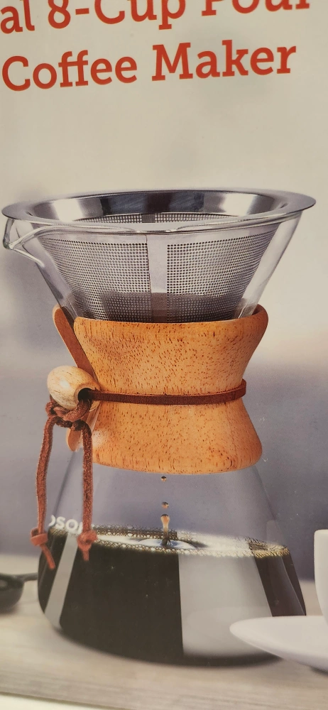 Glass pour-over coffee maker. Eight-cup capacity. Includes stainless steel micro mesh filter. Heat-resistant glass. Easy cleanup. Wooden collar and leather tie. New Product. Never Opened
