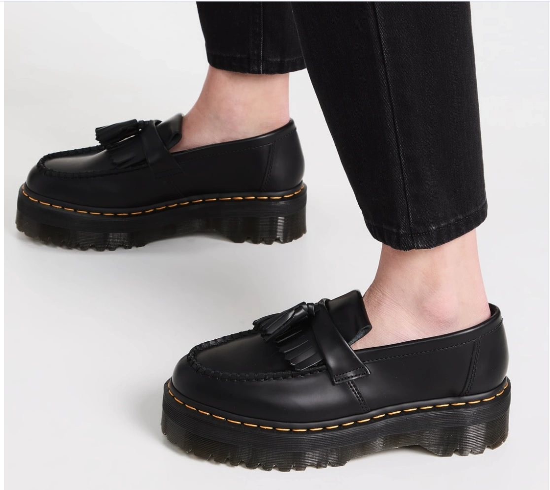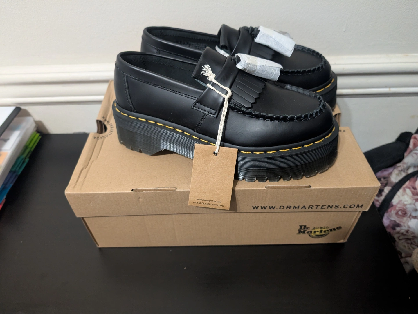 Selling a brand new pair of Dr. Martens Adrian Quad loafers! They're black, size US 6 Women'/ US 5 Men's, and come with the original box. These stylish loafers feature a chunky platform sole and classic tassel design, perfect for adding a bit of edge to any outfit