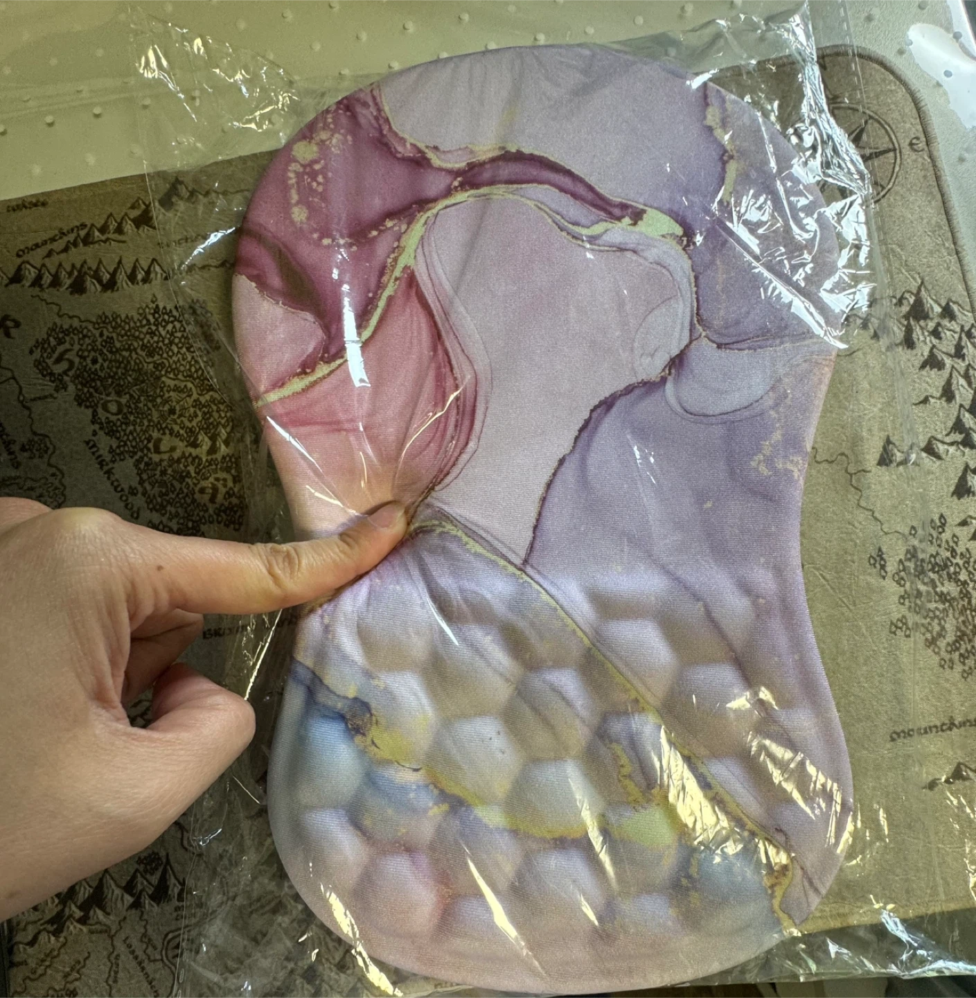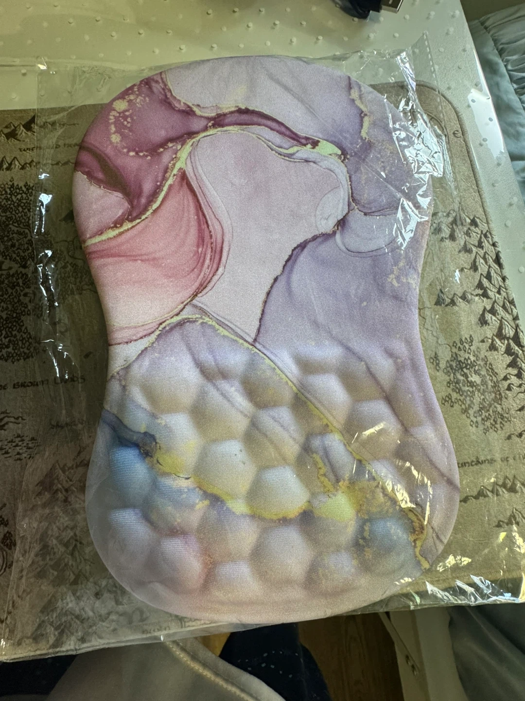 Selling a brand new ergonomic mouse pad with wrist rest! It's still in its packaging. The pad features a beautiful marble-like design in shades of purple, pink, and gold. Provides comfortable support for your wrist while you work or game. Non slip base so it stays in place