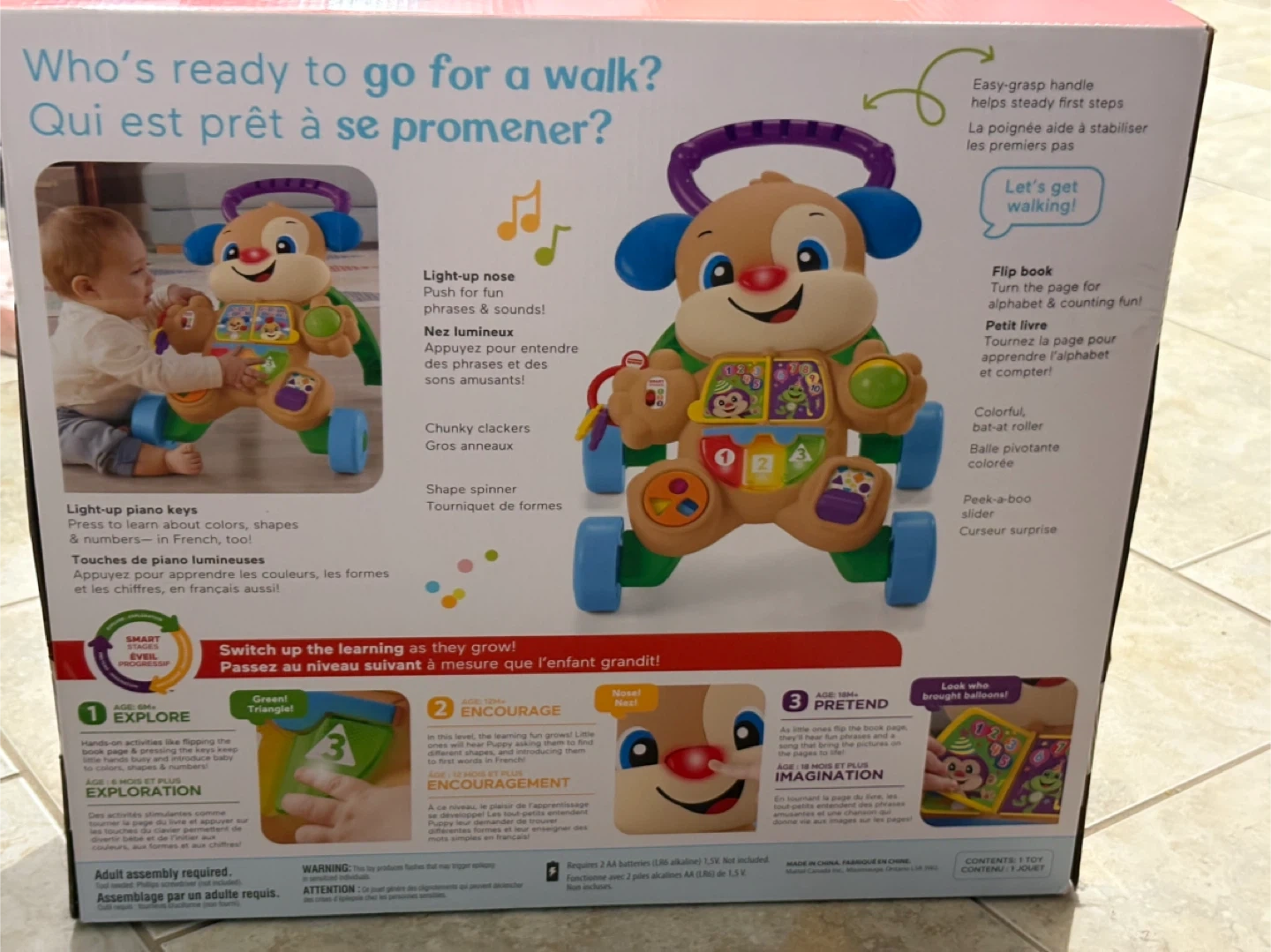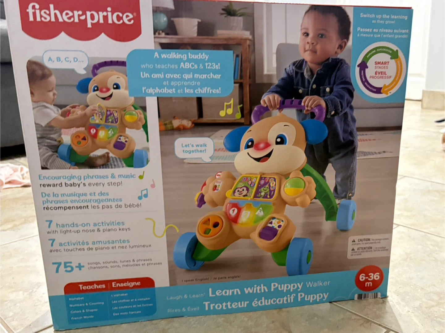 New walker Not used, we got this as gift. Get your little one walking with the Fisher-Price Learn with Puppy Walker! This interactive walker teaches ABCs and 123s with fun songs, sounds, and phrases. It features 7 hands-on activities with light-up piano keys to encourage baby's every step. Suitable for ages 6-36 months.