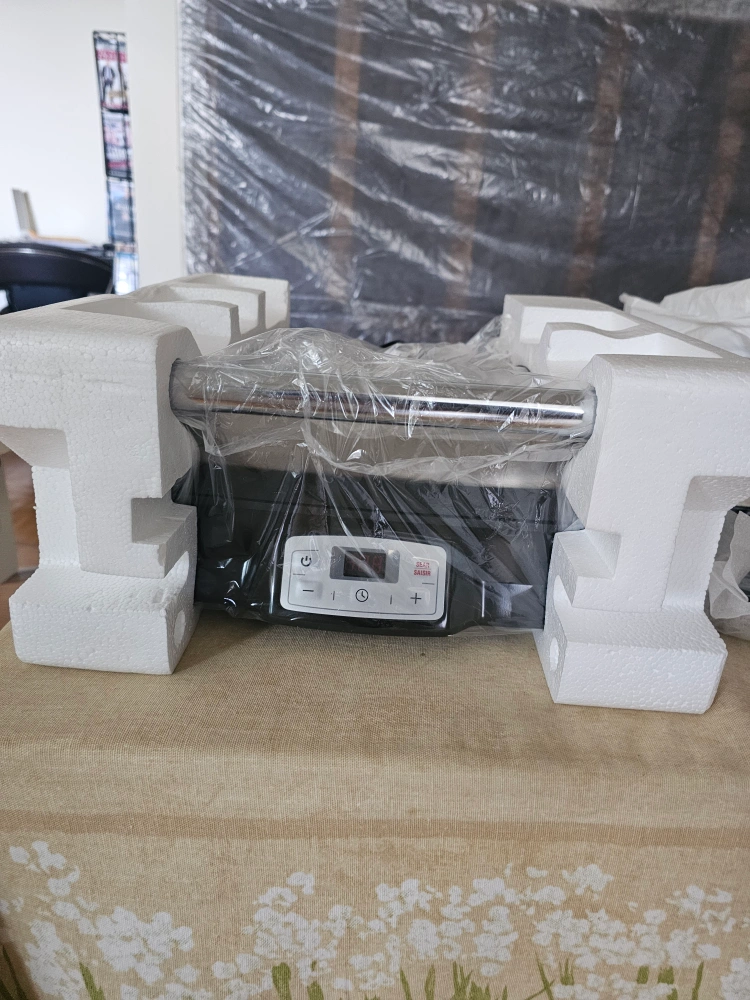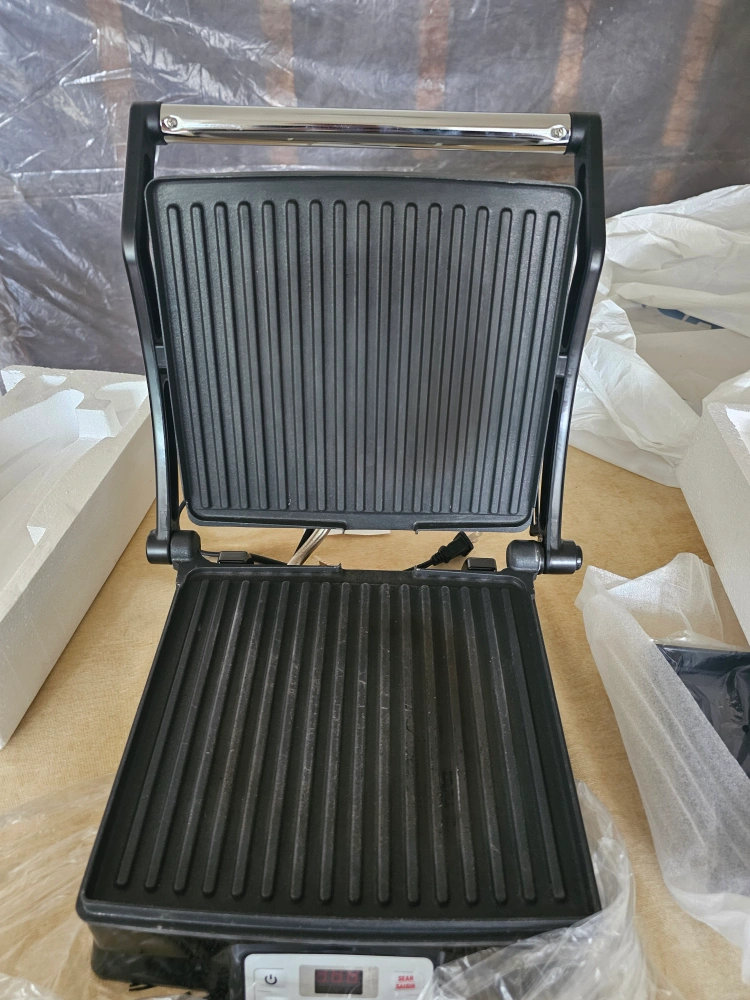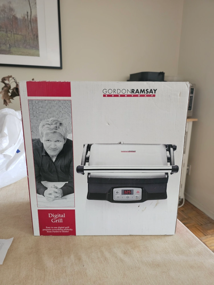 Selling a brand new Gordon Ramsay Everyday digital grill! It's still in its original packaging and has never been used. This grill opens 180 degrees as an indoor grill and features non-stick cooking plates, accurate digital timer, and temperature control with an LED display. It also has a 'Sear' function for optimal cooking temperature and allows you to heat up 260°C (500°F) rapidly. The grill includes a floating hinge and a drip tray. It operates at 1400W.