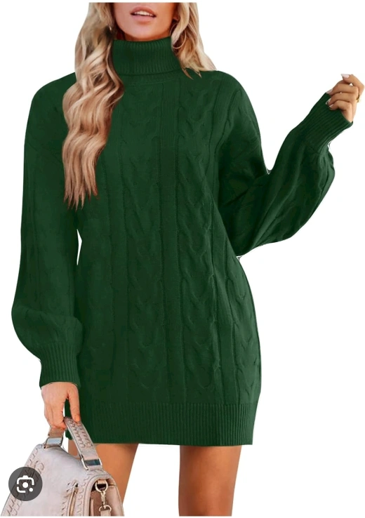 Selling a cozy green turtleneck sweater dress! It's perfect for the cooler weather and has a lovely cable knit design. The material feels soft and comfortable, making it great for everyday wear.