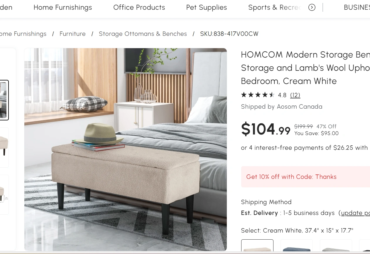 Modern Design: This foot stool has a nailhead trim design with a cashmere fabric feel and wooden legs, so it's a great accent piece in any room. - Hidden Storage: This bench with storage has 57L storage underneath the top lid, so you can hold blankets or pillows that need to be put away. With two gas rods for easy daily use. - Comfortable Seating: With cushioned tops and skin-friendly teddy velvet-feel fabric cover, this storage chest offers a nice rest stop to sit in for a quick chat with friends. - Stable Base: This bedroom bench has four rubber wood legs and a wooden frame that can hold up to 264 lbs (120 kg). Protective foot pads prevent the floor from scratching. - Ottoman Bench Overall Dimensions: 37.4" L x 15" W x 17.7" H (95 x 38 x 45 cm). Storage size: 35.4" W x 12.6" D x 7.9" H (90 x 32 x 20 cm), Weight capacity: 264 lbs (120 kg). Overall Dimensions: 37.4" x 15" x 17.7" Weight Capacity: 264 lbs Item Weight: 21 lbs Maximum Weight Recommendation: 264 lbs New, Factory packaging Condition: NEW
