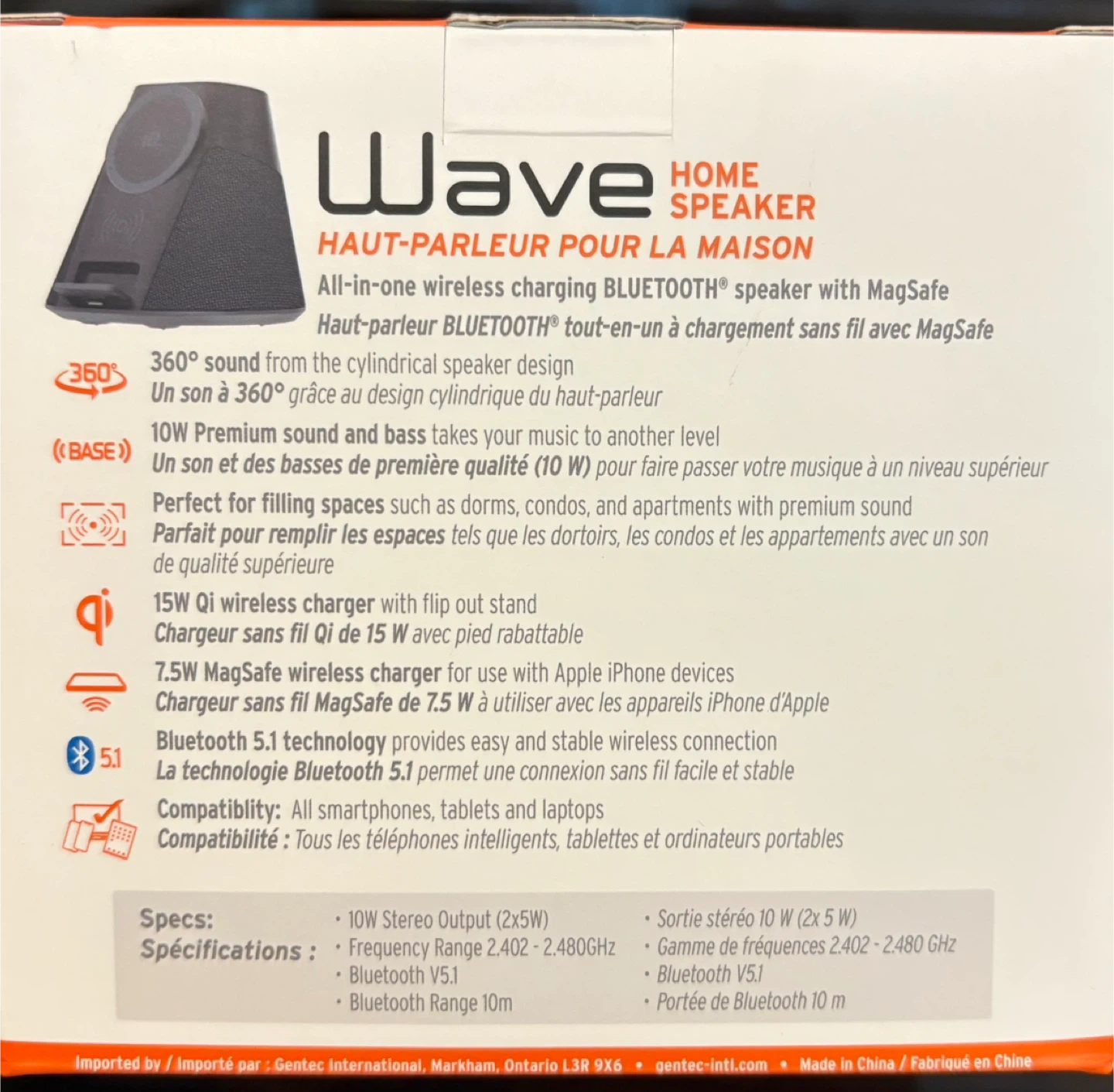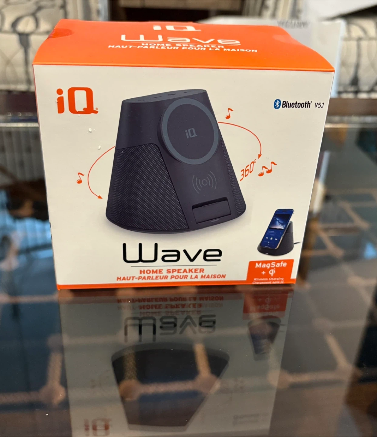 Selling a brand new iQ Wave Home Speaker! It's an all-in-one wireless charging Bluetooth speaker with MagSafe and Qi. Key features: - 360° sound from the cylindrical speaker design - 10W Premium sound and bass - 15W Qi wireless charger with flip out stand - 7.5W MagSafe wireless charger for use with Apple iPhone devices - Bluetooth 5.1 technology for easy and stable wireless connection - Compatible with smartphones, tablets, and laptops Specs: - 10W Stereo Output (2x5W) - Frequency Range 2.402 - 2.480GHz - Bluetooth V5.1 - Bluetooth Range 10m Get great sound and convenient wireless charging in one device!