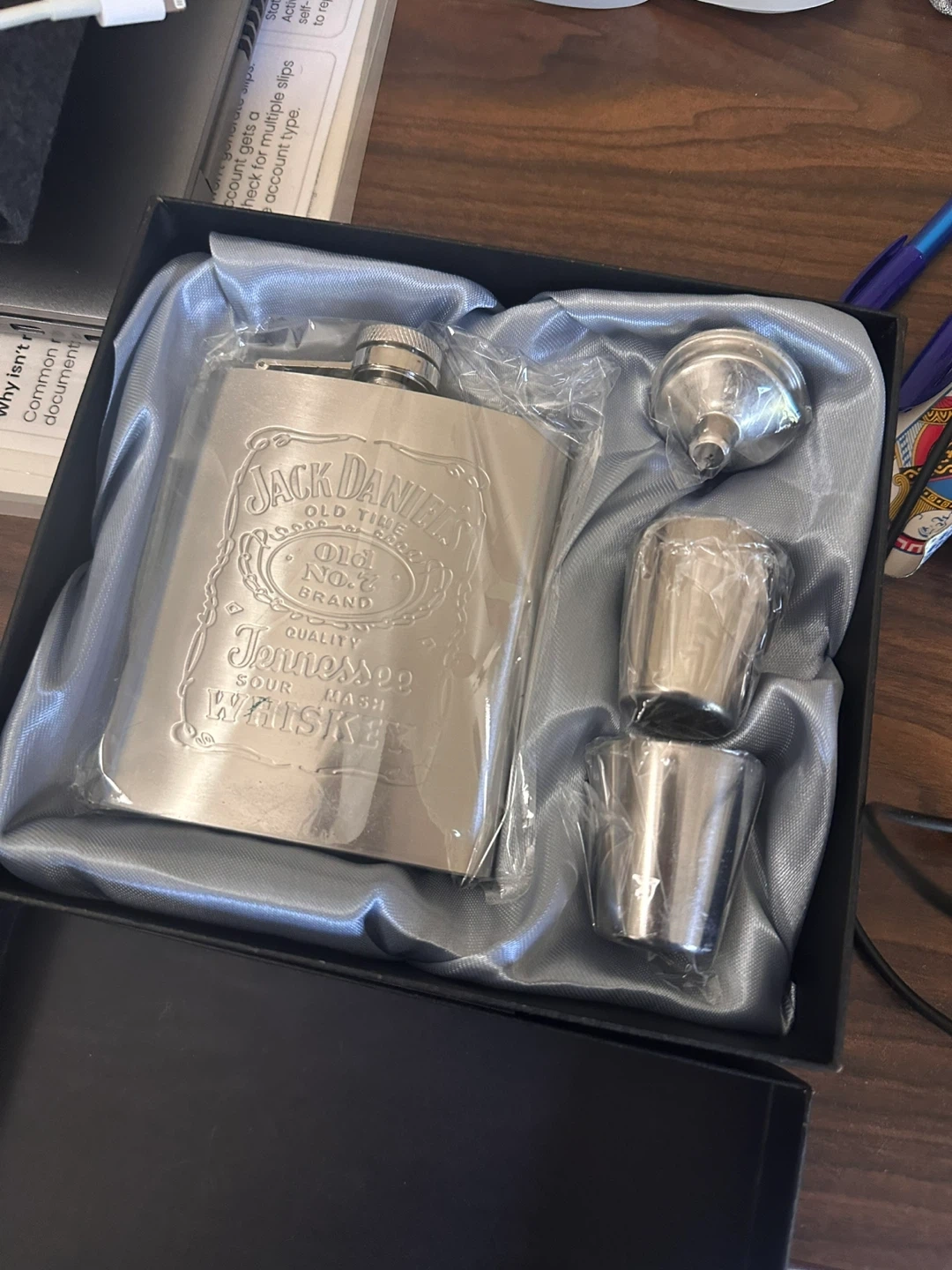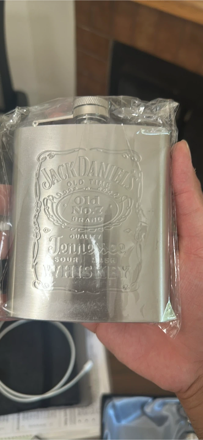 Selling a brand new Jack Daniel's flask gift set! It includes the flask, two shot glasses, and a funnel, all neatly packaged in a box. Perfect for any Jack Daniel's enthusiast!