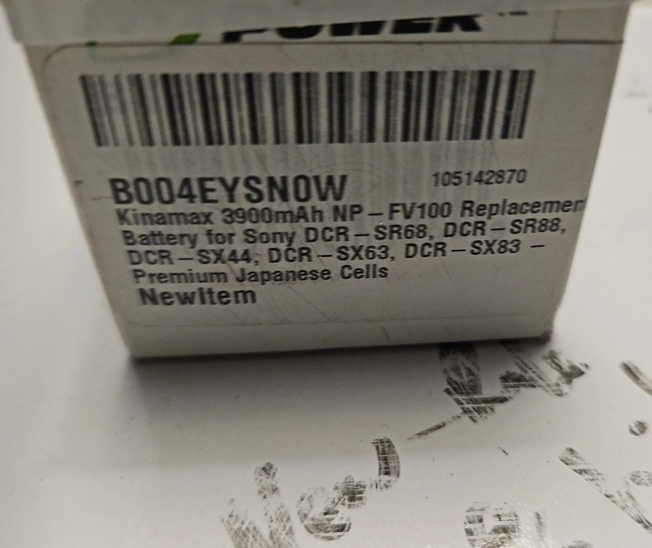 Selling a brand new Kinamax 3900mAh NP-FV100 replacement battery for Sony DCR cameras! This battery is compatible with various Sony DCR models, including SR68, SR88, SX44, SX63, and SX83. It features premium Japanese cells and comes in its original box