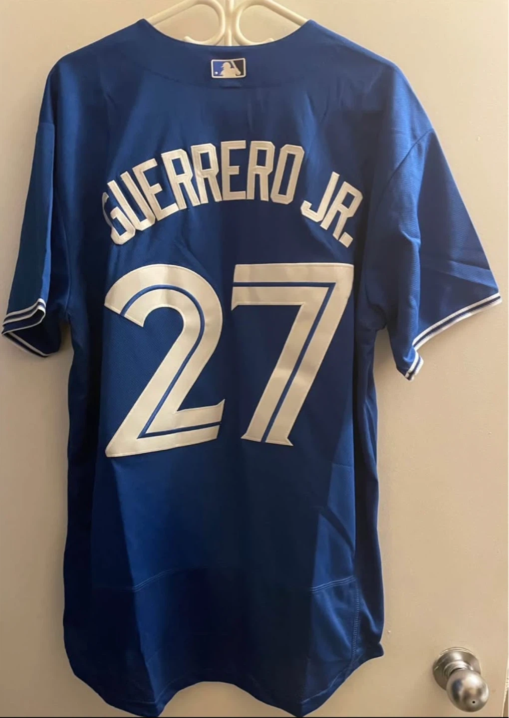 Brand New Mens TORONTO BLUE JAYS MLB Blue STITCHED Baseball Jersey GUERRERO Jr #27 XXL Perfect for any Jays fan! $40 Pick up in the Mapleview mall area in Burlington (Maple/Fairview)