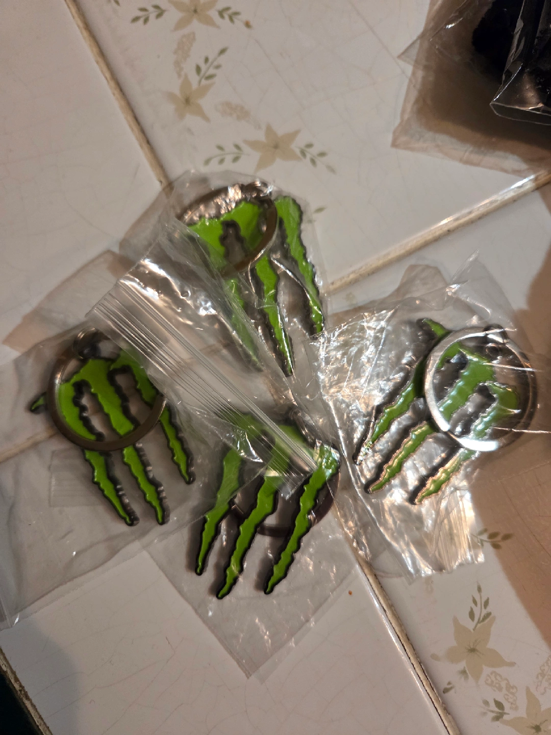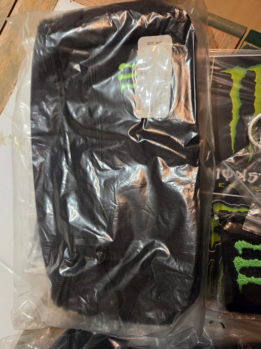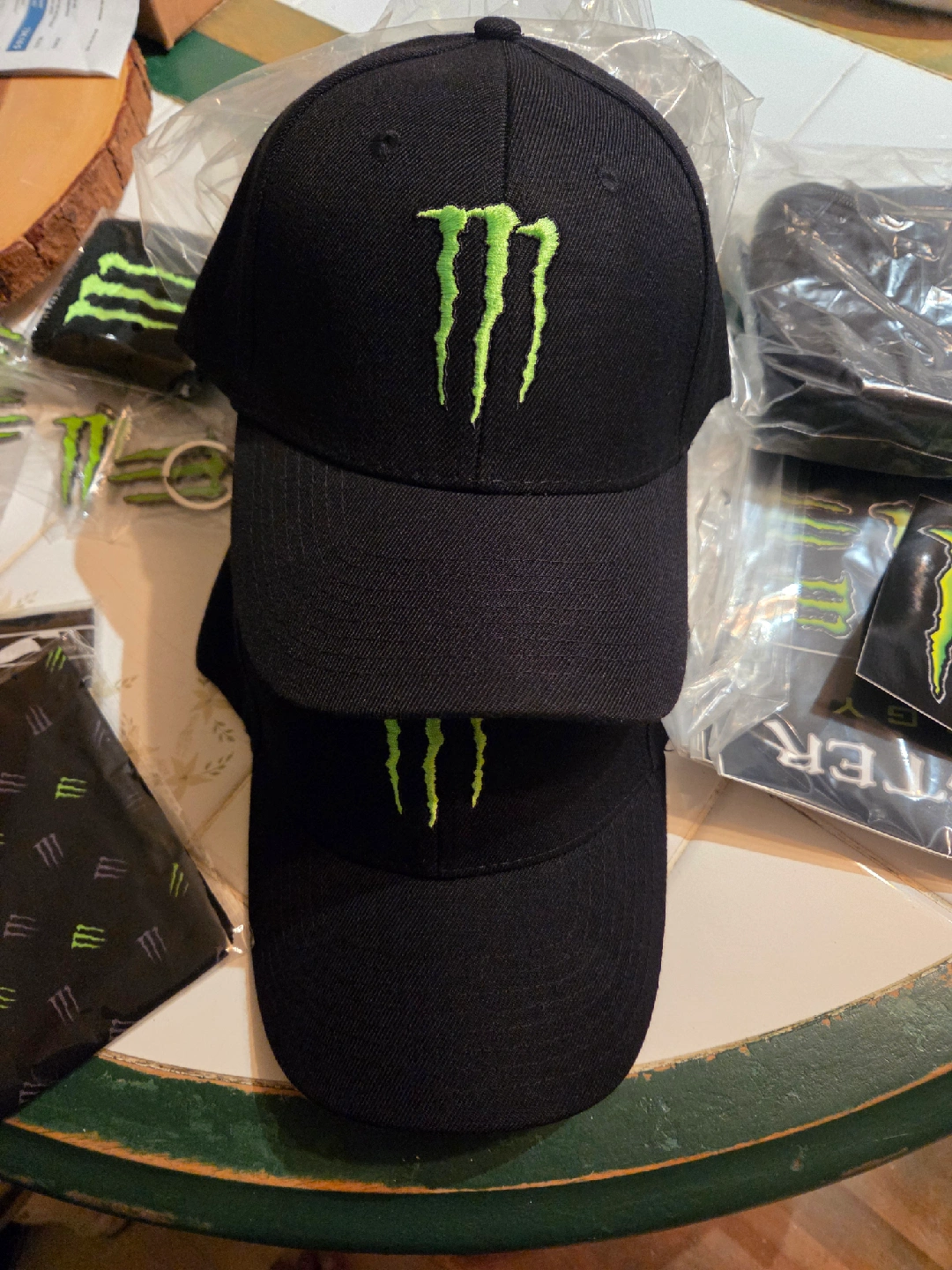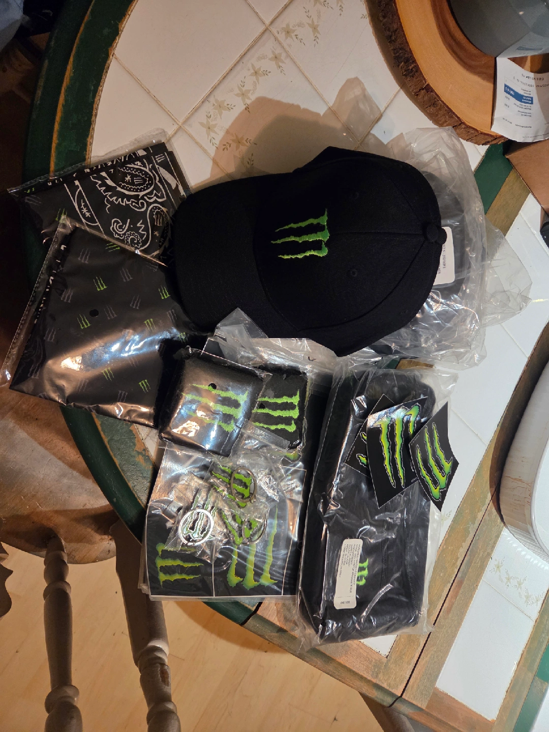 Selling brand new Monster Energy !!! Includes a hat, bandana, wristbands, fanny pack, sticker sheets and keychains, all with the iconic Monster logo. Perfect for any Monster fan!