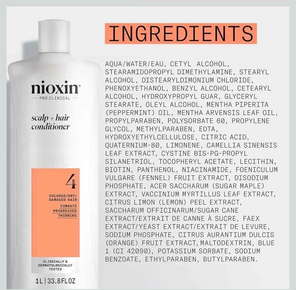 Brand New 1Litre/33.8 FL OZ Nioxin System 4 Scalp + Hair Thickening Conditioner for Colored, Dry, & Damaged Hair with Progressed Thinning | Maintain Vibrant Color | Nourish & Boost Hair Density with Niacinamide & Biotin | Restore Moisture & Resilience – Promotes Vitality PROFESSIONAL HAIR AND SCALP CLEANSER SHAMPOO for color treated hair with progressed thinning Award: Behind the Chair Stylist Choice Winner Favorite Thinning Haircare, 16 consecutive years MOISTURIZES AND CLEANSES DRY SCALP and chemically treated hair for thicker, fuller looking hair PREPARE HAIR AND SCALP for a complete hair treatment with Nioxin's three part System 3 Cleanser for Color Treated Hair with Light Thinning.