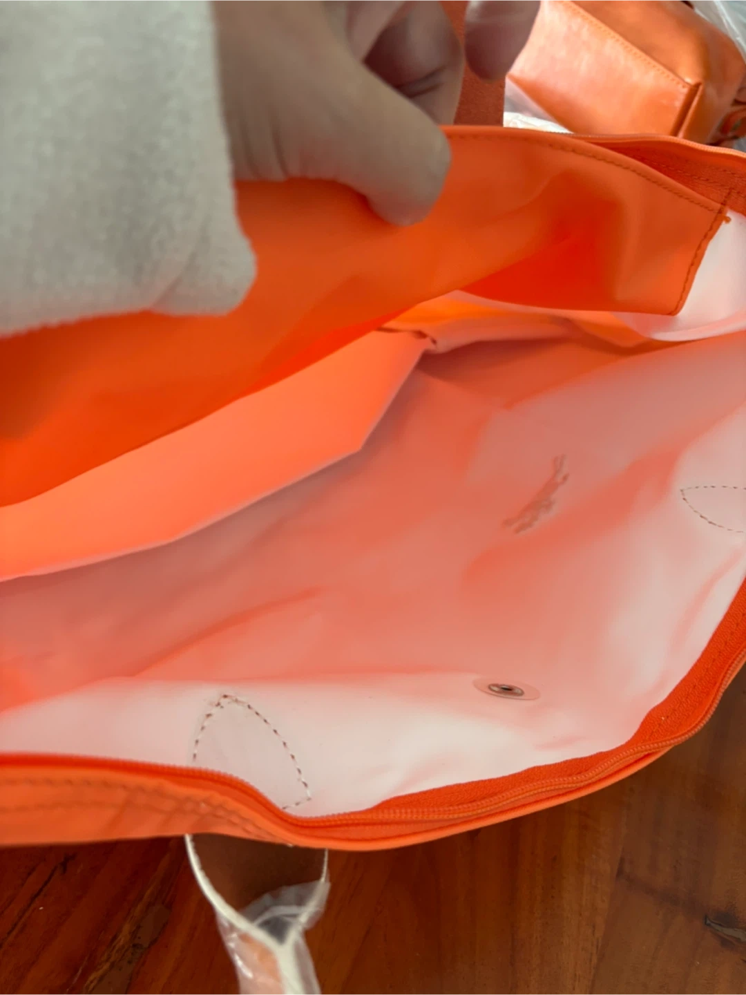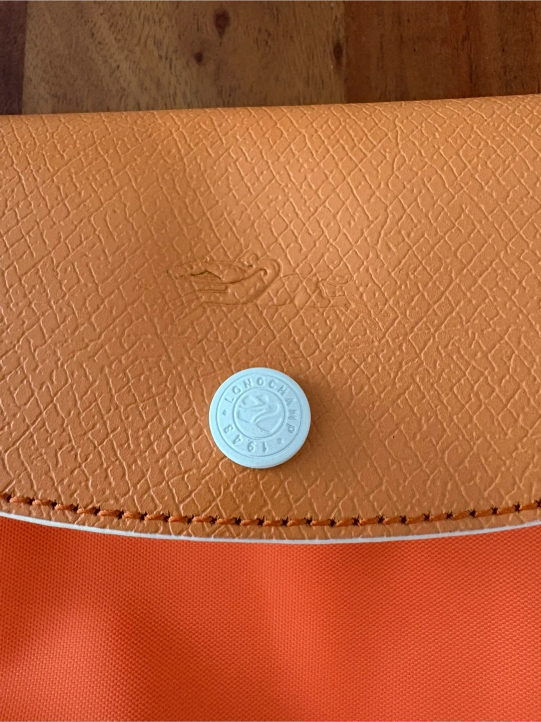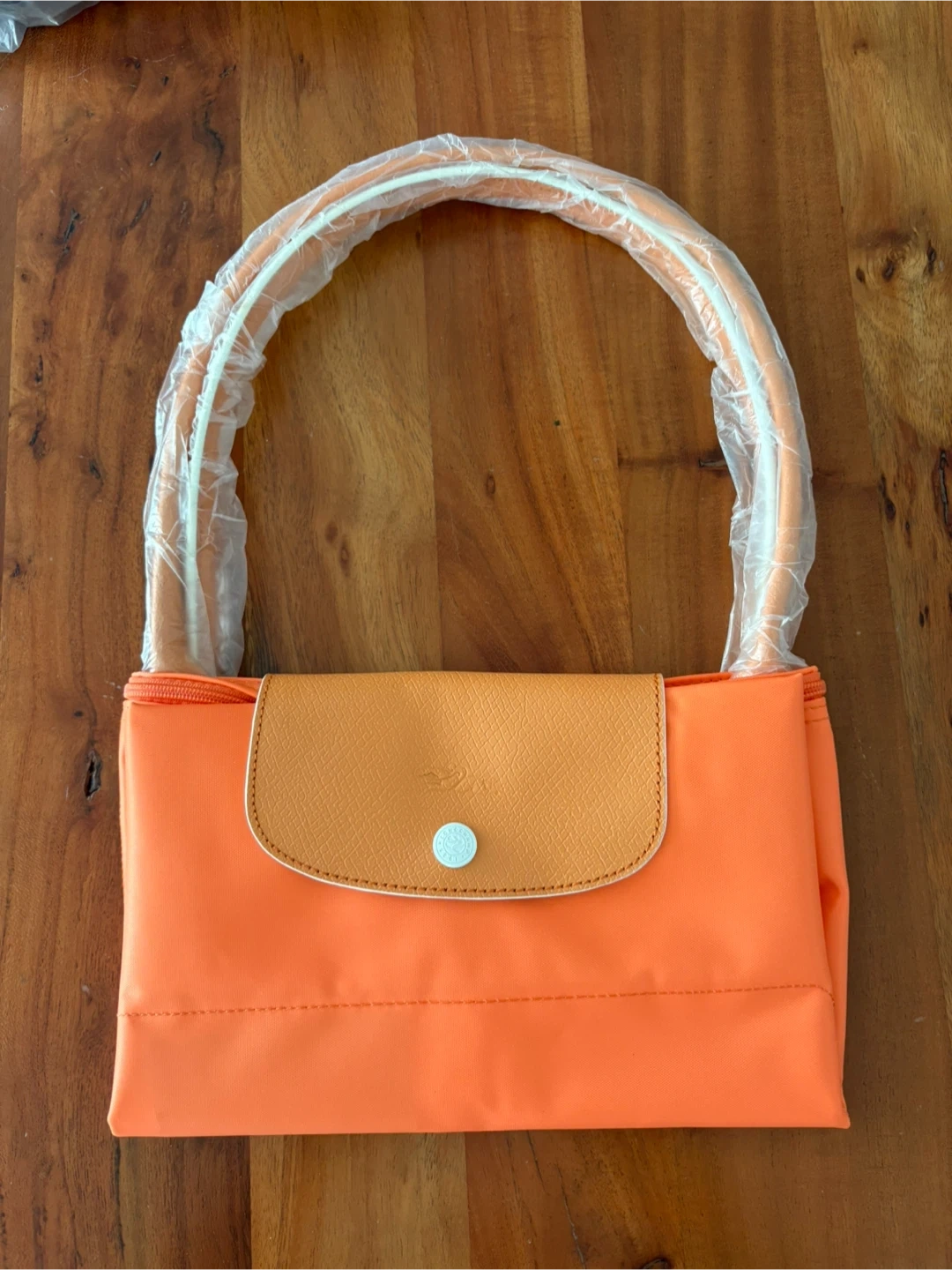 It's a vibrant orange color, lightweight and portable, making it great for everyday use or travel. The bag features the classic LC design 47x30cm