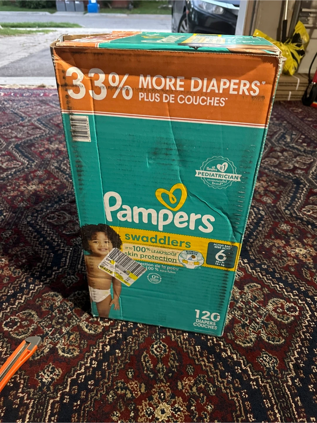 Selling a new box of Pampers Swaddlers diapers, size 6. There are 120 diapers in the box. These are great for babies who need extra protection and a comfortable fit! Comes in the original box