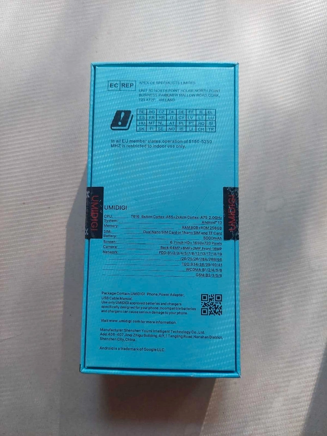 New in seal. Model: UMIDIGI A15 6.7 inches 720 x 1650 IPS touch screen. Powerful Octa-core (2x2.0 GHz Cortex-A75 & 6x1.8 GHz Cortex-A55) 8GB RAM / 256GB internal storage / microSDXC card slot. Triple back camera 64 MP, f/1.8, (wide), AF, Ultra-Clear AI 8 MP, f/2.2, 118˚ (ultrawide) 5 MP, f/2.4, (macro). Front camera 16 MP, f/2.2, (wide). Dual-band Wifi 802.11 a/b/g/n/ac Bluetooth 5.0 / GPS / FM radio. Fingerprint ID NFC (Near field communication) Supports Google Pay/Wallet etc USB Type-C charging and data port 5000mAh Lasting-Long Battery Android 13 2G/3G/4G/LTE mobile network. Support Dual-SIM card. Unlocked, can be used on any carrier.
