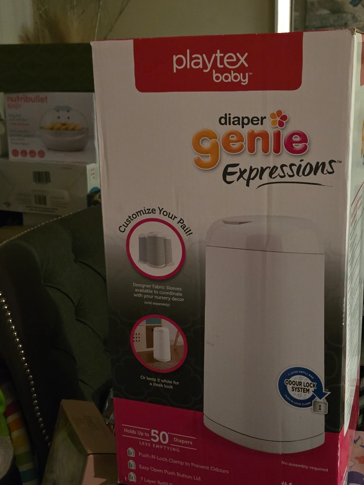 Selling a Playtex Baby Diaper Genie Expressions diaper pail. It features an odour lock system for freshness. It holds up to 50 diapers and has a push-n-lock clamp to prevent odours. It originally retails for $54.99