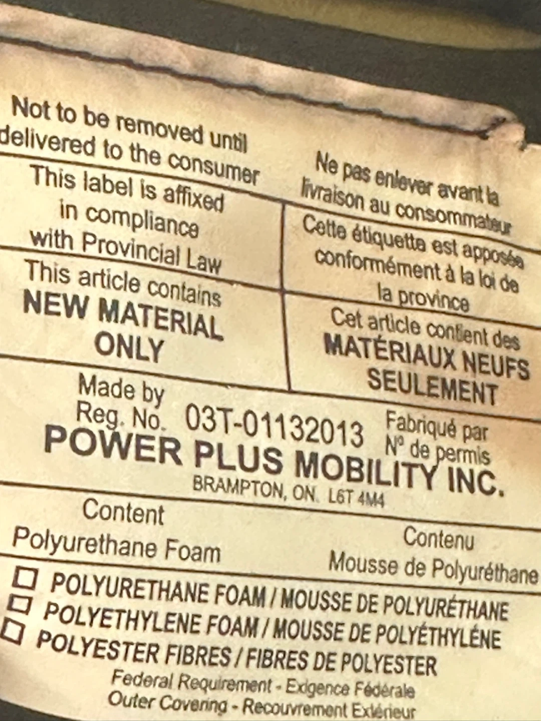 This is a brand wheelchair from Power Plus Mobility! Made with new materials including polyurethane foam, polyethylene foam, and polyester fibres