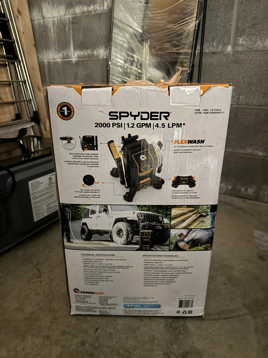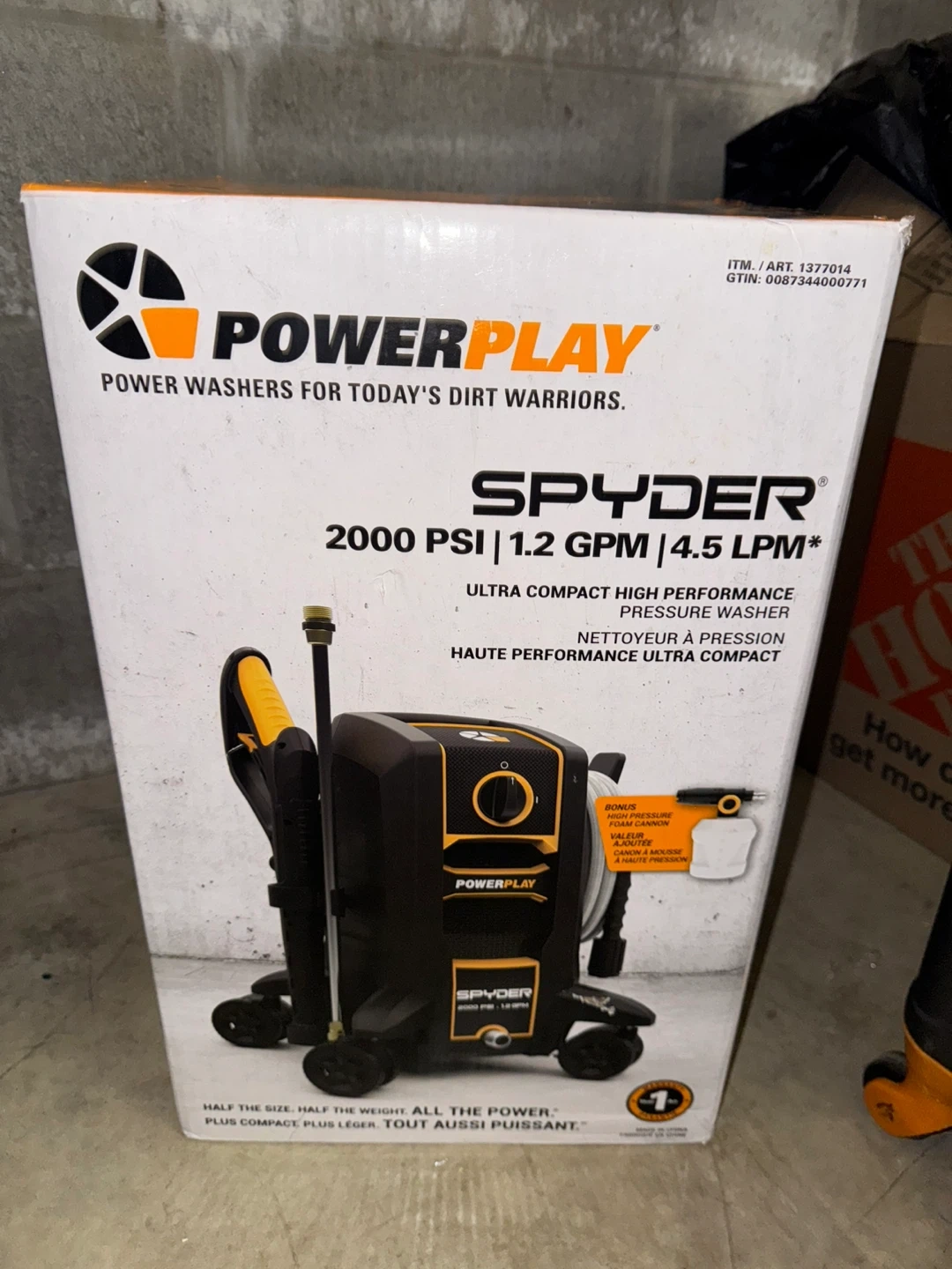 Selling a brand new Powerplay Spyder 2000 PSI pressure washer! It's still in the box and has never been used. This ultra compact high performance pressure washer is perfect for today's dirt warriors! It comes with all the original components and accessories.