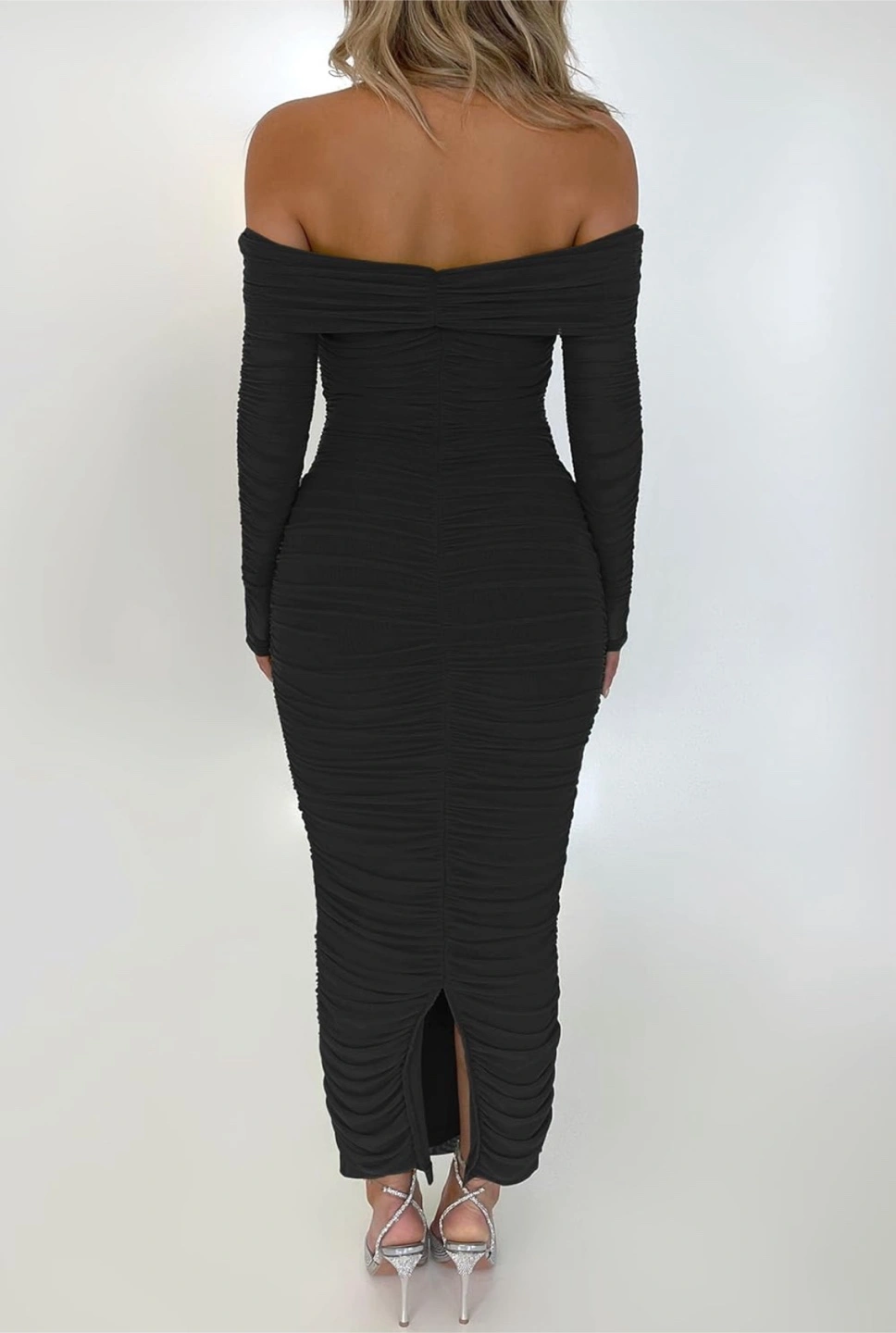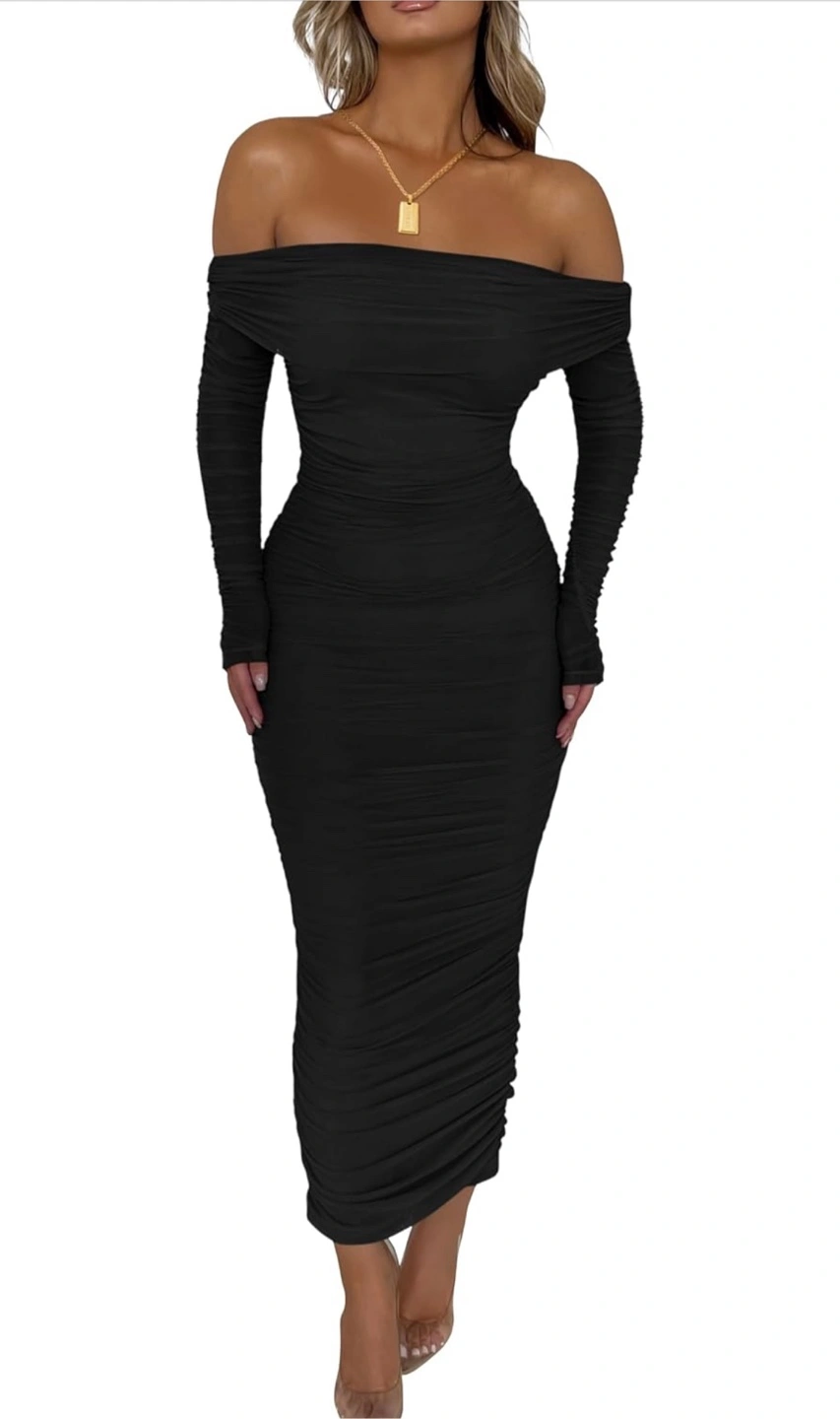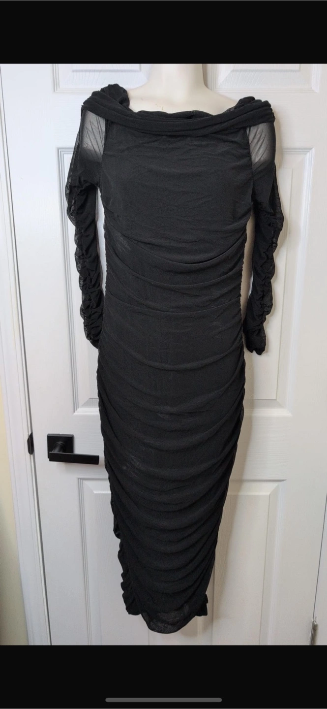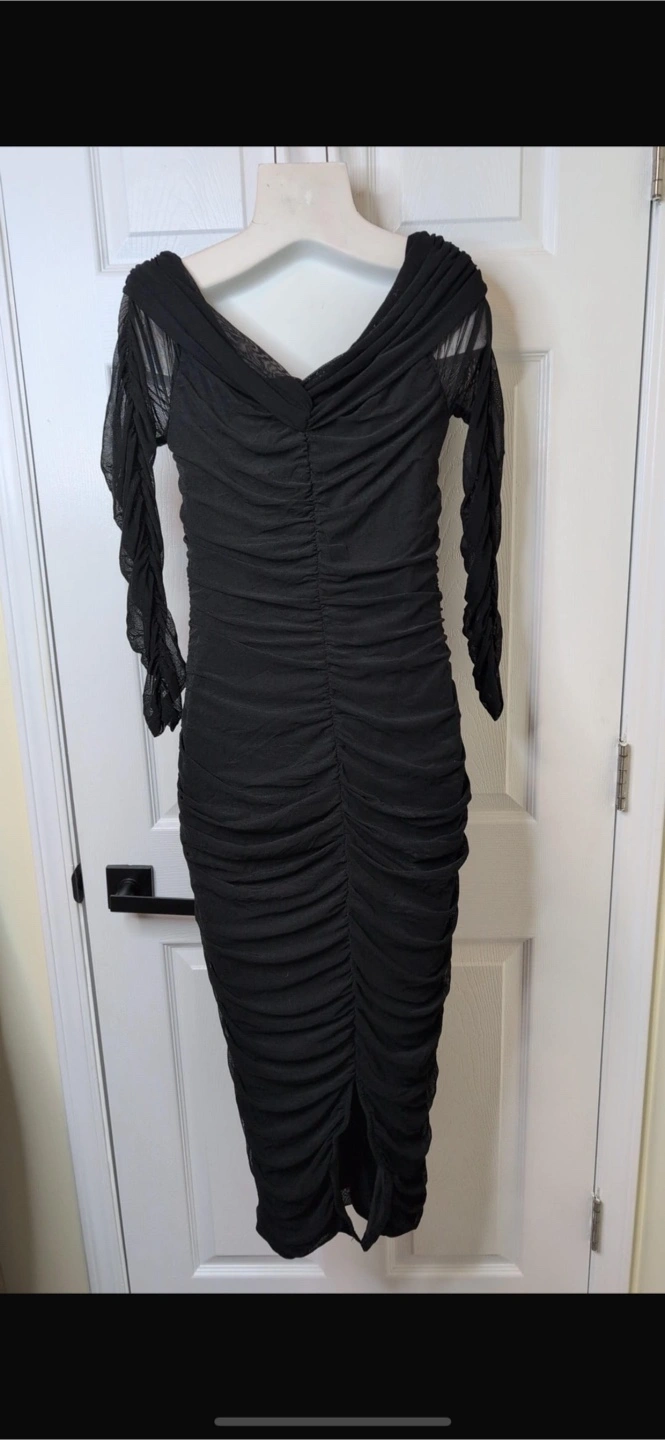 New with tag! Retails for $91 Selling a stylish black off-shoulder midi dress. It features a ruched design that accentuates the figure. Perfect for a night out or a special occasion!